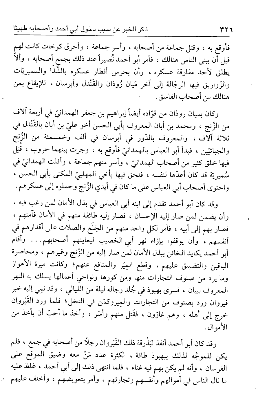 فأوقع به، وقتل جماعة من أصحابه، وأسر جماعة، وأحرق كوخات كانت لهم قبل أن يبنى الناس هنالك، فأمر أبو أحمد نُصيرًا عند ذلك بجمع أصحابه، وألّا يطلق لأحد مفارقة عسكره، وأن يحرس أقطار عسكره بالشَّذَا والسميريّات والزّواريق فيها الرجّالة إلى آخر مَيان رُوذان والقَنْدل وأبرسان، للإيقاع بمن هنالك من أصحاب الفاسق.