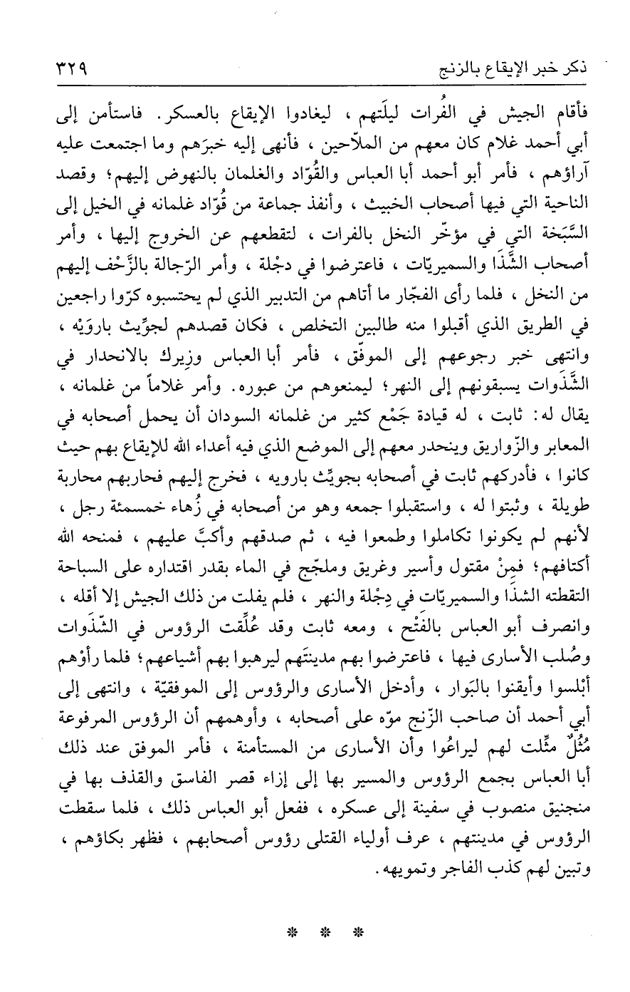 فأقام الجيش في الفُرات ليلَتهم، ليغادوا الإيقاع بالعسكر. فاستأمن إلى أبي أحمد غلام كان معهم من الملّاحين، فأنهى إليه خبرَهم وما اجتمعت عليه آراؤهم، فأمر أبو أحمد أبا العباس والقُوّاد والغلمان بالنهوض إليهم؛ وقصد الناحية التي فيها أصحاب الخبيث، وأنفذ جماعة من قُوّاد غلمانه في الخيل إلى السَّبَخة التي في مؤخّر النخل بالفرات، لتقطعهم عن الخروج إليها، وأمر أصحاب الشَّذَا والسميريّات، فاعترضوا في دجْلة، وأمر الرّجالة بالزَّحْف إليهم من النخل، فلما رأى الفجّار ما أتاهم من التدبير الذي لم يحتسبوه كرّوا راجعين في الطريق الذي أقبلوا منه طالبين التخلص، فكان قصدهم لجوَّيث باروَيْه، وانتهى خبر رجوعهم إلى الموفّق، فأمر أبا العباس وزِيرك بالانحدار في الشَّذَوات يسبقونهم إلى النهر، ليمنعوهم من عبوره. وأمر غلامًا من غلمانه، يقال له: ثابت، له قيادة جَمْع كثير من غلمانه السودان أن يحمل أصحابه في المعابر والزّواريق وينحدر معهم إلى الموضع الذي فيه أعداء الله للإيقاع بهم حيث كانوا، فأدركهم ثابت في أصحابه بجويِّث بارويه، فخرج إليهم فحاربهم محاربة طويلة، وثبتوا له، واستقبلوا جمعه وهو من أصحابه في زُهاء خمسمئة رجل، لأنهم لم يكونوا تكاملوا وطمعوا فيه، ثم صدقهم وأكبَّ عليهم، فمنحه الله أكتافهم؛ فمِنْ مقتول وأسير وغريق وملجّج في الماء بقدر اقتداره على السباحة التقطته الشذَا والسميريّات في دِجْلة والنهر، فلم يفلت من ذلك الجيش إلا أقله، وانصرف أبو العباس بالفَتْح، ومعه ثابت وقد عُلِّقت الرؤوس في الشّذَوات وصُلب الأسارى فيها، فاعترضوا بهم مدينتَهم ليرهبوا بهم أشياعهم؛ فلما رأوْهم أبْلسوا وأيقنوا بالبَوار، وأدخل الأسارى والرؤوس إلى الموفقيّة، وانتهى إلى أبي أحمد أن صاحب الزّنج موّه على أصحابه، وأوهمهم أن الرؤوس المرفوعة مُثُلٌ مثِّلت لهم ليراعُوا وأن الأسارى من المستأمنة، فأمر الموفق عند ذلك أبا العباس بجمع الرؤوس والمسير بها إلى إزاء قصر الفاسق والقذف بها في منجنيق منصوب في سفينة إلى عسكره، ففعل أبو العباس ذلك، فلما سقطت الرؤوس في مدينتهم، عرف أولياء القتلى رؤوس أصحابهم، فظهر بكاؤهم، وتبين لهم كذب الفاجر وتمويهه.