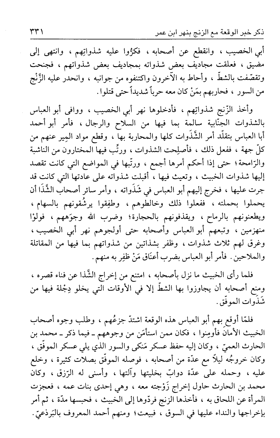 وأخذ الزّنج شذواتِهم، فأدخلوها نهر أبي الخصيب، ووافى أبو العباس بالشذوات الجنّابية سالمة بما فيها من السلاح والرجال، فأمر أبو أحمد أبا العباس بتقلّد أمر الشَّذَوات كلها والمحاربة بها، وقطع مواد المِير عنهم من كلّ جهة، ففعل ذلك، فأصلِحت الشذوات، ورتَّب فيها المختارون من الناشبة والرّامحة؛ حتى إذا أحكم أمرها أجمع، ورتّبها في المواضع التي كانت تقصد إليها شذوات الخبيث، وتعيث فيها، أقبلت شذواته على عادتها التي كانت قد جرت عليها، فخرج إليهم أبو العباس في شَذَواته، وأمر سائر أصحاب الشَّذَا أن يحملوا بحملته، ففعلوا ذلك وخالطوهم، وطفِقوا يرشُقونهم بالسهام، ويطعنونهم بالرماح، ويقذفونهم بالحجارة؛ وضرب الله وجوَههم، فولوْا منهزمين، وتبعهم أبو العباس وأصحابه حتى أولجوهم نهر أبي الخصيب، وغرق لهم ثلاث شذوات، وظفر بشذاتين من شذواتهم بما فيها من المقاتلة والملاحين. فأمر أبو العباس بضرب أعنَاق مَنْ ظفِر به منهم.
