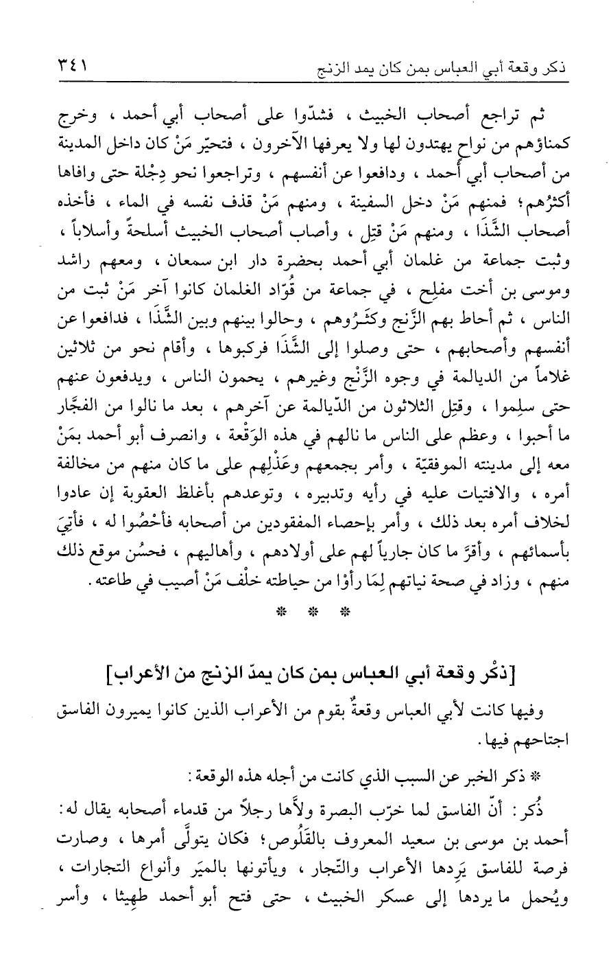 ثم تراجع أصحاب الخبيث، فشدّوا على أصحاب أبي أحمد، وخرج كمناؤهم من نواحٍ يهتدون لها ولا يعرفها الآخرون، فتحيّر مَنْ كان داخل المدينة من أصحاب أبي أحمد، ودافعوا عن أنفسهم، وتراجعوا نحو دِجْلة حتى وافاها أكثرُهم؛ فمنهم مَنْ دخل السفينة، ومنهم مَنْ قذف نفسه في الماء، فأخذه أصحاب الشَّذَا، ومنهم مَنْ قتِل، وأصاب أصحاب الخبيث أسلحةً وأسلابًا، وثبت جماعة من غلمان أبي أحمد بحضرة دار ابن سمعان، ومعهم راشد وموسى بن أخت مفلِح، في جماعة من قُوّاد الغلمان كانوا آخر مَنْ ثبت من الناس، ثم أحاط بهم الزَّنج وكثَرُوهم، وحالوا بينهم وبين الشَّذَا، فدافعوا عن أنفسهم وأصحابهم، حتى وصلوا إلى الشَّذَا فركبوها، وأقام نحو من ثلاثين غلامًا من الديالمة في وجوه الزَّنْج وغيرهم، يحمون الناس، ويدفعون عنهم حتى سلِموا، وقتِل الثلاثون من الدّيالمة عن آخرهم، بعد ما نالوا من الفجَّار ما أحبوا، وعظم على الناس ما نالهم في هذه الوَقْعة، وانصرف أبو أحمد بمَنْ معه إلى مدينته الموفقيّة، وأمر بجمعهم وعَذْلِهم على ما كان منهم من مخالفة أمره، والافتيات عليه في رأيه وتدبيره، وتوعدهم بأغلظ العقوبة إن عادوا لخلاف أمره بعد ذلك، وأمر بإحصاء المفقودين من أصحابه فأحْصُوا له، فأتِيَ بأسمائهم، وأقرَّ ما كان جاريًا لهم على أولادهم، وأهاليهم، فحسُن موقع ذلك منهم، وزاد في صحة نياتهم لِمَا رأوْا من حياطته خلْف مَنْ أصيب في طاعته.