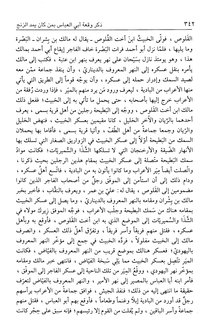 القَلوص، فولّى الخبيثُ ابنَ أخت القُلوص - يقال له مالك بن بِشران - البَصْرة وما يليها، فلما نزل أبو أحمد فرات البَصْرة خاف الفاجر إيقاع أبي أحمد بمالك هذا، وهو يومئذ نازل بسَيْحان على نهر يعرف بنهر ابن عتبة، فكتب إلى مالك يأمره بنقل عسكره إلى النهر المعروف بالديناريّ، وأن ينفذ جماعة ممّن معه لصيد السمك وإدرار حمله إلى عسكره، وأن يوجّه قومًا إلى الطريق التي يأتي منها الأعراب من البادية، ليعرف ورود مَن يرد منهم بالميَر، فإذا وردت رُفقة من الأعراب خرج إليها بأصحابه، حتى يحمل ما تأتي به إلى الخبيث؛ ففعل ذلك مالك ابن أخت القَلوص، ووجّه إلى البَطيحة رجلين من أهل قرية بسمى، يعرف أحدهما بالرَّيان والآخر الخليل، كانا مقيمين بعسكر الخبيث، فنهض الخليل والرّيان وجمعا جماعةً من أهل الطّفّ، وأتيا قرية بسمى، فأقاما بها يحملان السمك من البَطيحة أوّلًا إلى عسكر الخبيث في الزواريق الصغار التي تسلك بها الأنهار الضّيقة والأرخنجان التي لا تسلكها الشَّذَا والسُّميريّات؛ فكانت موادّ سمك البَطيحة متّصلة إلى عسكر الخبيث بمقام هذين الرجلين بحيث ذكرنا، واتّصلت أيضًا مِيَر الأعراب وما كانوا يأتون به من البادية، فاتّسع أهلُ عسكره، ودام ذلك إلى أن استأمن إلى الموفّق رجلٌ من أصحاب الفاجر الذين كانوا مضمومين إلى القَلوص، يقال له: على بن عمر، ويعرف بالنقَّاب، فأخبر بخبر مالك بن بِشْران ومقامه بالنهر المعروف بالديناريّ، وما يصل إلى عسكر الخبيث بمقامه هناك من سَمك البطيحة وجلْب الأعراب، فوجَّه الموفق زِيرك مولاه في الشَّذَا والسُميريّات إلى الموضع الذي به ابن أخت القَلوص، فاوقع به وبأهل عسكره، فقتل منهم فريقًا وأسر فريقًا، وتفرَّق أهلُ ذلك العسكر، وانصرف مالك إلى الخبيث مفلولًا، فردَّه الخبيث في جمع إلى مؤخّر النهر المعروف باليهوديّ؛ فعسكر هنالك بموضع قريب من النهر المعروف بالفيّاض، فكانت الميَر تتّصِل بعسكر الخبيث مما يَلِي سَبخة الفيّاض، فانتهى خبر مالك ومقامه بمؤخر نهر اليهودي، ووقْعُ المِيَر من تلك الناحية إلى عسكر الفاجر إلى الموفّق، فأمر ابنه أبا العباس بالمصير إلى نهر الأمير، والنهر المعروف بالفيّاض لتعرّف حقيقة ما انتهى إليه من ذلك، فنفذ الجيش، فوافق جماعةً من الأعراب يرأسهم رجلٌ قد أورد من البادية إبلًا وغنمًا وطعامًا، فأوقع بهم أبو العباس، فقتل منهم جماعةً وأسر الباقين، ولم يُفلت من القوم إلا رئيسهم، فإنه سبق على حِجْر كانت