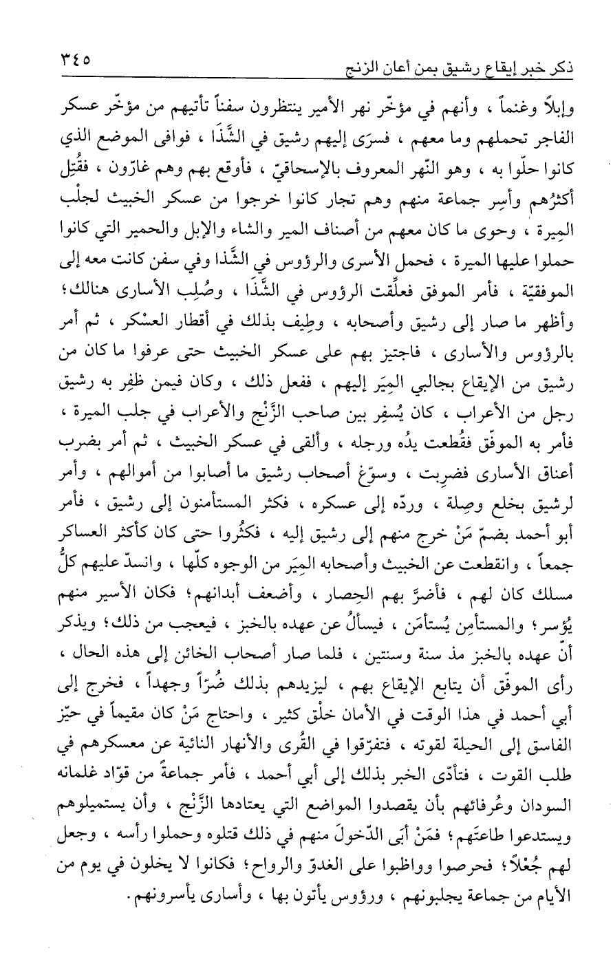 وإبلًا وغنمًا، وأنهم في مؤخّر نهر الأمير ينتظرون سفنًا تأتيهم من مؤخّر عسكر الفاجر تحملهم وما معهم، فسرَى إليهم رشيق في الشَّذَا، فوافى الموضع الذي كانوا حلّوا به، وهو النّهر المعروف بالإسحاقيّ، فأوقع بهم وهم غارّون، فقُتِل أكثرُهم وأسِر جماعة منهم وهم تجار كانوا خرجوا من عسكر الخبيث لجلْب المِيرة، وحوى ما كان معهم من أصناف المير والشاء والإبل والحمير التي كانوا حملوا عليها الميرة، فحمل الأسرى والرؤوس في الشَّذا وفي سفن كانت معه إلى الموفقيّة، فأمر الموفق فعلِّقت الرؤوس في الشَّذَا، وصُلِب الأسارى هنالك؛ وأظهر ما صار إلى رشيق وأصحابه، وطِيف بذلك في أقطار العسْكر، ثم أمر بالرؤوس والأسارى، فاجتيز بهم على عسكر الخبيث حتى عرفوا ما كان من رشيق من الإيقاع بجالبي المِيَر إليهم، ففعل ذلك، وكان فيمن ظفِر به رشيق رجل من الأعراب، كان يُسفِر بين صاحب الزَّنْج والأعراب في جلب الميرة، فأمر به الموفّق فقُطعت يدُه ورجله، وألقى في عسكر الخبيث، ثم أمر بضرب أعناق الأسارى فضرِبت، وسوّغ أصحاب رشيق ما أصابوا من أموالهم، وأمر لرشيق بخلع وصِلة، وردّه إلى عسكره، فكثر المستأمنون إلى رشيق، فأمر أبو أحمد بضمّ مَنْ خرج منهم إلى رشيق إليه، فكثُروا حتى كان كأكثر العساكر جمعًا، وانقطعت عن الخبيث وأصحابه المِيَر من الوجوه كلّها، وانسدّ عليهم كلُّ مسلك كان لهم، فأضرَّ بهم الحِصار، وأضعف أبدانهم؛ فكان الأسير منهم يُؤسر؛ والمستأمِن يُستأمَن، فيسألُ عن عهده بالخبز، فيعجب من ذلك؛ ويذكر أنّ عهده بالخبز مذ سنة وسنتين، فلما صار أصحاب الخائن إلى هذه الحال، رأى الموفّق أن يتابع الإيقاع بهم، ليزيدهم بذلك ضُرًّا وجهدًا، فخرج إلى أبي أحمد في هذا الوقت في الأمان خلْق كثير، واحتاج مَنْ كان مقيمًا في حيّز الفاسق إلى الحيلة لقوته، فتفرّقوا في القُرى والأنهار النائية عن معسكرهم في طلب القوت، فتأدّى الخبر بذلك إلى أبي أحمد، فأمر جماعةً من قوّاد غلمانه السودان وعُرفائهم بأن يقصدوا المواضع التي يعتادها الزَّنْج، وأن يستميلوهم ويستدعوا طاعتَهم؛ فمَنْ أبَى الدّخولَ منهم في ذلك قتلوه وحملوا رأسه، وجعل لهم جُعْلًا؛ فحرصوا وواظبوا على الغدوّ والرواح؛ فكانوا لا يخلون في يوم من الأيام من جماعة يجلبونهم، ورؤوس يأتون بها، وأسارى يأسرونهم.