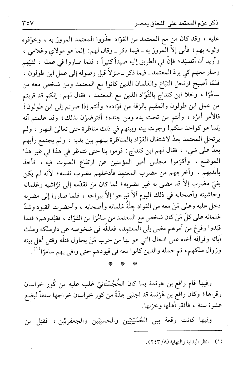 عليه، وقد كان من مع المعتمد من القوّاد حذّروا المعتمد المرورَ به، وخوّفوه وثوبه بهم؛ فأبى إلّا المرورَ به - فيما ذكر - وقال لهم: إنما هو مولاي وغلامي، وأريد أن أتصيّد؛ فإنّ في الطريق إليه صيدًا كثيرًا، فلما صاروا في عمله، لقيَهم وسار معهم كي يردَ المعتمد - فيما ذكر - منزلًا قبل وصوله إلى عمل ابن طولون، فلمّا أصبح ارتحل التبّاع والغلمان الذين كانوا مع المعتمد ومن شخص معه من سامُرّا، وخلا ابن كنداج بالقُوّاد الذين مع المعتمد، فقال لهم: إنكم قد قربتم من عمل ابن طولون والمقيم بالرّقة من قوّاده؛ وأنتم إذا صرتم إلى ابن طولون؛ فالأمر أمرُه، وأنتم من تحت يده ومن جنده؛ أفترضوْن بذلك؛ وقد علمتم أنه إنما هو كواحد منكم! وجرت بينه وبينهم في ذلك مناظرة حتى تعالىَ النهار، ولم يرتحل المعتمد بعدُ لاشتغال القوّاد بالمناظرة بينهم بين يديه، ولم يجتمع رأيهم بعدُ على شيء، فقال لهم ابن كنداج: قوموا بنا حتى نتناظر في هذا في غير هذا الموضع، وأكرَموا مجلس أمير المؤمنين عن ارتفاع الصوت فيه، فأخذ بأيديهم، وأخرجهم من مضرب المعتمِد فأدخلهم مضرب نفسه؛ لأنه لم يكن بقيَ مضرب إلّا قد مضى به غير مضربه؛ لما كان من تقدّمه إلى فرَّاشيه وغلمانه وحاشيته وأصحابه في ذلك اليوم ألّا تبرحوا إلّا ببراحه، فلما صاروا إلى مضربه دخل عليه وعلى مَنْ معه من القواد جِلّةُ غلمانه وأصحابه، وأحضرت القيود وشدّ غلمانه على كلّ مَنْ كان شخص مع المعتمد من سامُرّا من القوّاد، فقيَّدوهم؛ فلما قيّدوا وفرغ من أمرهم مضى إلى المعتمِد، فعذلَه في شخوصه عن دار ملكه وملك آبائه وفراقه أخاه على الحال التي هو بها من حرب مَنْ يحاول قتلَه وقتل أهل بيته وزوال ملكهم، ثم حمله والذين كانوا معه في قيودهم حتى وافى بهم سامرّا (١).