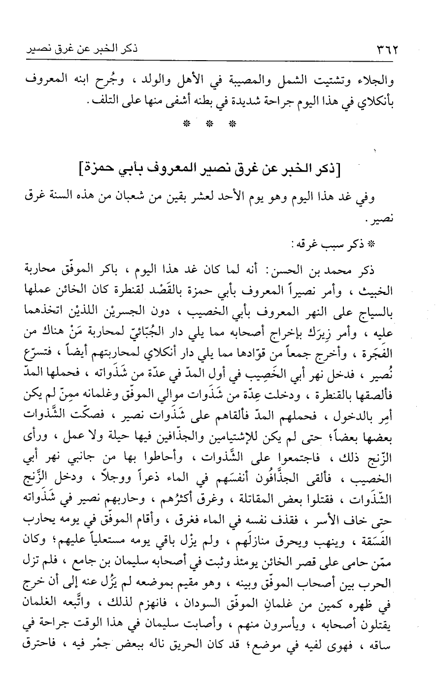 ذكر محمد بن الحسن: أنه لما كان غد هذا اليوم، باكر الموفّق محاربة الخبيث، وأمر نصيرًا المعروف بأبي حمزة بالقَصْد لقنطرة كان الخائن عملها بالسياج على النهر المعروف بأبي الخصيب، دون الجسريْن اللذيْن اتخذهما عليه، وأمر زِيرَك بإخراج أصحابه مما يلي دار الجُبّائيّ لمحاربة مَنْ هناك من الفَجَرة، وأخرج جمعًا من قوّادها مما يلي دار أنكلاي لمحاربتهم أيضًا، فتسرّع نُصير، فدخل نهر أبي الخَصِيب في أول المدّ في عدّة من شَذَواته، فحملها المدّ فألصقها بالقنطرة، ودخلت عِدّة من شَذَوات موالي الموفّق وغلمانه ممِنّ لم يكن أمِر بالدخول، فحملهم المدّ فألقاهم على شَذوات نصير، فصكّت الشَّذوات بعضها بعضًا؛ حتى لم يكن للإشتيامين والجذّافين فيها حيلة ولا عمل، ورأى الزّنج ذلك، فاجتمعوا على الشَّذوات، وأحاطوا بها من جانبي نهر أبي الخصيب، فألقى الجذَّافُون أنفسَهم في الماء ذعرًا ووجلًا، ودخل الزَّنج الشّذَوات، فقتلوا بعض المقاتلة، وغرق أكثرُهم، وحاربهم نصير في شَذَواته حتى خاف الأسر، فقذف نفسه في الماء فغرق، وأقام الموفّق في يومه يحارب الفَسَقة، وينهب ويحرق منازلَهم، ولم يزْل باقي يومه مستعليًا عليهم؛ وكان ممّن حامى على قصر الخائن يومئذ وثبت في أصحابه سليمان بن جامع، فلم تزل الحرب بين أصحاب الموفّق وبينه، وهو مقيم بموضعه لم يَزُل عنه إلى أن خرج في ظهره كمين من غلمانِ الموفّق السودان، فانهزم لذلك، واتَّبعه الغلمان يقتلون أصحابه، ويأسرون منهم، وأصابت سليمان في هذا الوقت جراحة في ساقه، فهوى لفيه في موضع؛ قد كان الحريق ناله ببعض جمْر فيه، فاحترق