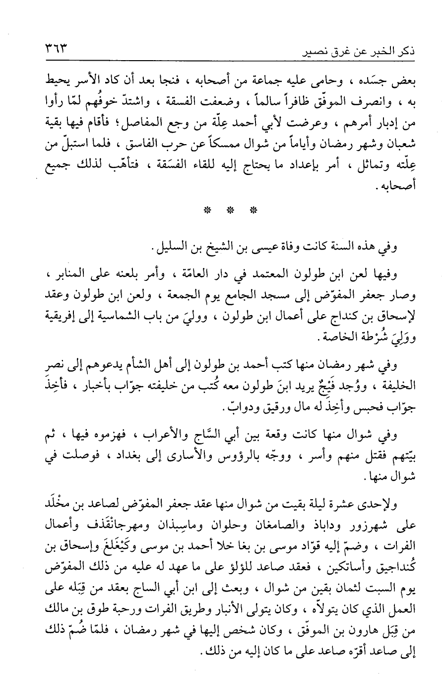 بعض جسَده، وحامى عليه جماعة من أصحابه، فنجا بعد أن كاد الأسر يحيط به، وانصرف الموفّق ظافرًا سالمًا، وضعفت الفسقة، واشتدّ خوفُهم لمّا رأوا من إدبار أمرهم، وعرضت لأبي أحمد عِلّة من وجع المفاصل؛ فأقام فيها بقية شعبان وشهر رمضان وأيامًا من شوال ممسكًا عن حرب الفاسق، فلما استبلّ من عِلّته وتماثل، أمر بإعداد ما يحتاج إليه للقاء الفسَقة، فتأهّب لذلك جميع أصحابه.