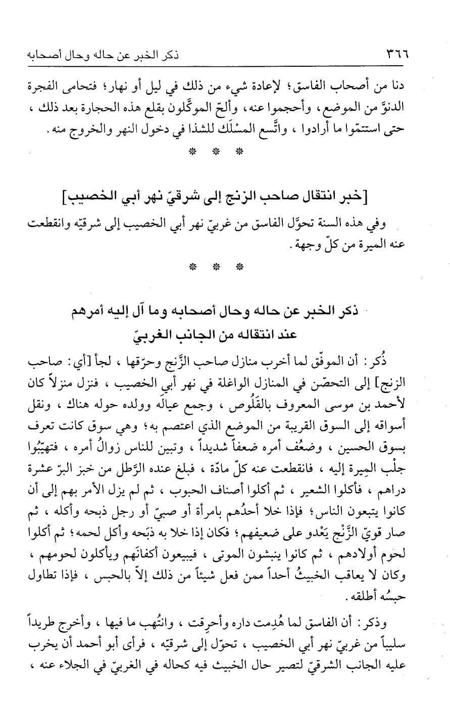 ذُكر: أن الموفّق لما أخرب منازل صاحب الزَّنج وحرّقها، لجأ [أي: صاحب الزنج] إلى التحصّن في المنازل الواغلة في نهر أبي الخصيب، فنزل منزلًا كان لأحمد بن موسى المعروف بالقَلُوص، وجمع عيالَه وولده حوله هناك، ونقل أسواقه إلى السوق القريبة من الموضع الذي اعتصم به؛ وهي سوق كانت تعرف بسوق الحسين، وضعُف أمره ضعفًا شديدًا، وتبين للناس زوالُ أمره، فتهيّبُوا جلْب المِيرة إليه، فانقطعت عنه كلّ مادّة، فبلغ عنده الرَّطل من خبز البرّ عشرة دراهم، فأكلوا الشعير، ثم أكلوا أصناف الحبوب، ثم لم يزل الأمر بهم إلى أن كانوا يتبعون الناس؛ فإذا خلا أحدُهم بامرأة أو صبيّ أو رجل ذبحه وأكله، ثم صار قويّ الزَّنْج يَعْدو على ضعيفهم؛ فكان إذا خلا به ذبَحه وأكل لحمه؛ ثم أكلوا لحوم أولادهم، ثم كانوا ينبشون الموتى، فيبيعون أكفانَهم ويأكلون لحومهم، وكان لا يعاقب الخبيثُ أحدًا ممن فعل شيئًا من ذلك إلّا بالحبس، فإذا تطاول حبسُه أطلقه.
