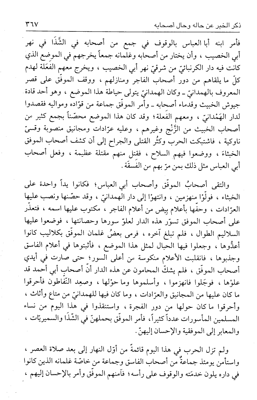 فأمر ابنه أبا العباس بالوقوف في جمع من أصحابه في الشَّذَا في نهر أبي الخصيب، وأن يختار من أصحابه وغلمانه جمعًا يخرجهم في الموضِع الذي كانت فيه دار الكرنبائيّ من شرقيّ نهر أبي الخصيب، ويخرج معهم الفعَلة لهدم كلّ ما يلقاهم من دور أصحاب الفاجر ومنازلهم، ووقف الموفّق على قصر المعروف بالهمدانيّ - وكان الهمدانيّ يتولى حياطة هذا الموضع، وهو أحد قادة جيوش الخبيث وقدماء أصحابه - وأمر الموفّق جماعة من قوّاده ومواليه فقصدوا لدار الهَمْدانيّ، ومعهم الفَعلة؛ وقد كان هذا الموضع محصّنًا بجمع كثير من أصحاب الخبيث من الزَّنْج وغيرهم، وعليه عرّادات ومجانيق منصوبة وقسيّ ناوكية، فاشتبكت الحرب وكثُر القتلى والجراح إلى أن كشف أصحاب الموفّق الخبثاءَ، ووضعوا فيهم السلاح، فقتل منهم مقتلة عظيمة، وفعل أصحاب أبي العباس مثل ذلك بمن مرّ بهم من الفَسقَة.