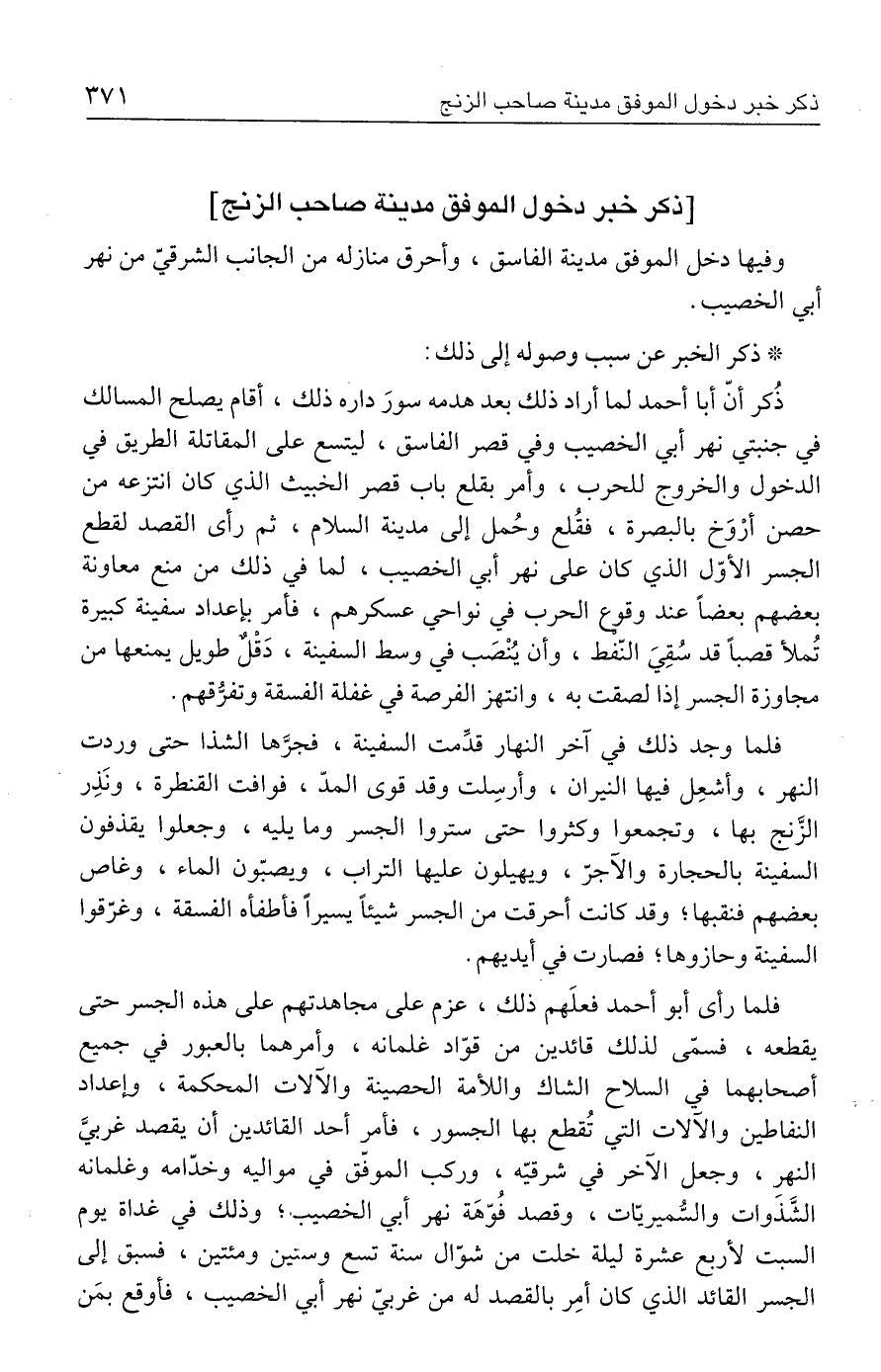 وفيها دخل الموفّق مدينة الفاسق، وأحرق منازله من الجانب الشرقيّ من نهر أبي الخصيب.
