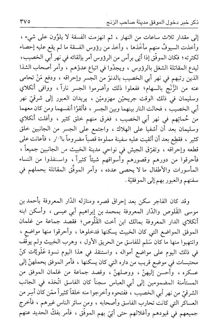 إلى مقدار ثلاث ساعات من النهار، ثم انهزمت الفسقة لا يلوُون على شيء، وأخذت السيوفُ منهم مأخَذها، وأخذ من رؤوس الفسقة ما لم يقع عليه إحصاء لكثرته؛ فكان الموفّق إذا أتى برأس من الرؤوس أمر بإلقائه في نهر أبي الخصيب، ليدع المقاتلة الشغل بالرؤوس، ويجدّوا في اتباع عدوّهم، وأمر أصحاب الشذا الذين رتبهم في نهر أبي الخصيب بالدنوّ من الجسر وإحراقه، ودفع مَنْ تحامى عنه من الزَّنْج بالسهام؛ ففعلوا ذلك وأضرموا الجسر نارًا، ووافى أنكلاي وسليمان في ذلك الوقت جريحيْن مهزوميْن، يريدان العبور إلى شرقيّ نهر أبي الخصيب، فحالت النار بينهما وبين الجسر، فألقوْا أنفسهما ومن كان معهما من حُماتِهم في نهر أبي الخصيب، فغرق منهم خلق كثير، وأفلت أنكلاي وسليمان بعد أن أشفيا على الهلاك، واجتمع على الجسر من الجانبين خلق كثير، فقطِع بعد أن ألقيت عليه سفينة مملوءة قصبًا مضرومًا بالدار، فأعانت على قطعه وإحراقه، وتفرّق الجيش في نواحي مدينة الخبيث من الجانبين جميعًا، فأحرقوا من دورهم وقصورهم وأسواقهم شيئًا كثيرًا، واستنقذوا من النساء المأسورات والأطفال ما لا يحصى عدده، وأمر الموفَّق المقاتلة بحملهم في سفنهم والعبور بهم إلى الموفقيّة.