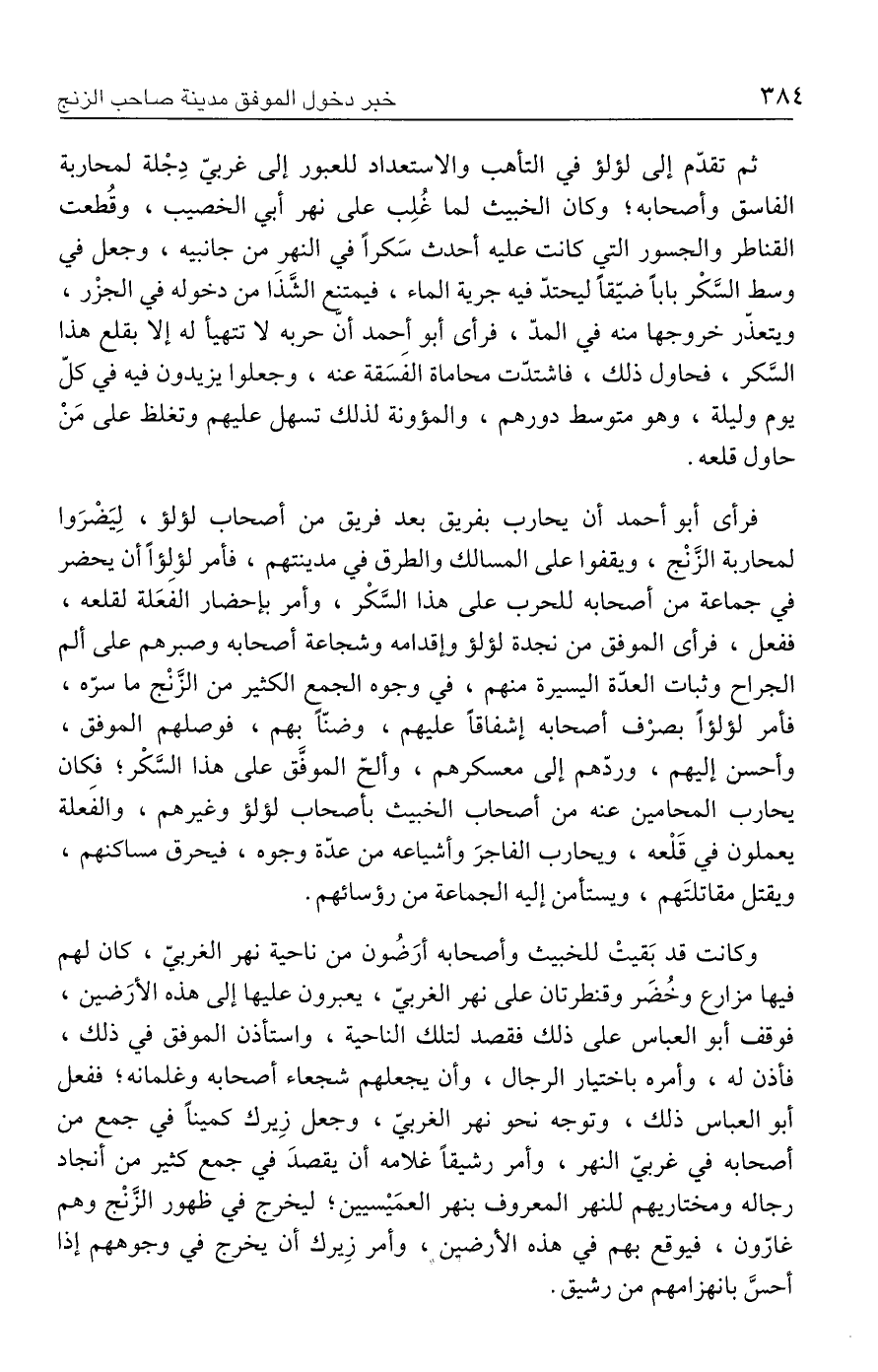 وكانت قد بَقيتْ للخبيث وأصحابه أرَضُون من ناحية نهر الغربيّ، كان لهم فيها مزارع وخُضَر وقنطرتان على نهر الغربيّ، يعبرون عليها إلى هذه الأرَضين، فوقف أبو العباس على ذلك فقصد لتلك الناحية، واستأذن الموفّق في ذلك، فأذن له، وأمره باختيار الرجال، وأن يجعلهم شجعاء أصحابه وغلمانه؛ ففعل أبو العباس ذلك، وتوجه نحو نهر الغربيّ، وجعل زِيرك كمينًا في جمع من أصحابه في غربيّ النهر، وأمر رشيقًا غلامه أن يقصدَ في جمع كثير من أنجاد رجاله ومختاريهم للنهر المعروف بنهر العمَيْسيين؛ ليخرج في ظهور الزَّنْج وهم غارّون، فيوقع بهم في هذه الأرضين، وأمر زِيرك أن يخرج في وجوههم إذا أحسَّ بانهزامهم من رشيق.