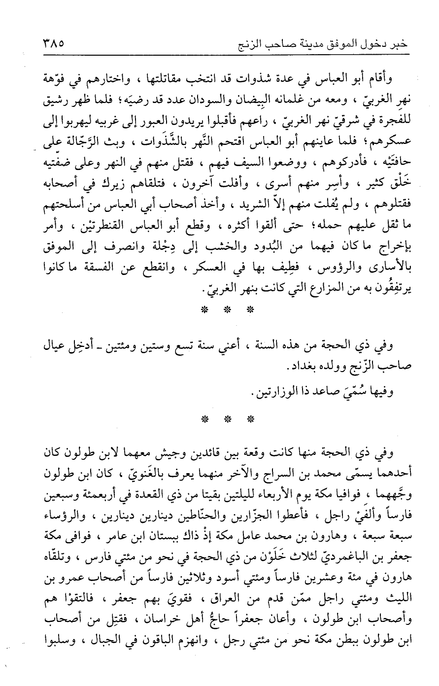 وأقام أبو العباس في عدة شذوات قد انتخب مقاتلتها، واختارهم في فوّهة نهرِ الغربيّ، ومعه من غلمانه البِيضان والسودان عدد قد رضيَه؛ فلما ظهر رشيق للفجرة في شرقيّ نهر الغربيّ، راعهم فأقبلوا يريدون العبور إلى غربيه ليهربوا إلى عسكرهم؛ فلما عاينهم أبو العباس اقتحم النَّهر بالشَّذَوات، وبث الرَّجّالة على حافتَيْه، فأدركوهم، ووضعوا السيف فيهم، فقتل منهم في النهر وعلى ضفّتيه خَلْق كثير، وأسِر منهم أسرى، وأفلت آخرون، فتلقاهم زيرك في أصحابه فقتلوهم، ولم يُفلت منهم إلّا الشريد، وأخذ أصحاب أبي العباس من أسلحتهم ما ثقل عليهم حمله؛ حتى ألقوا أكثره، وقطع أبو العباس القنطرتيْن، وأمر بإخراج ما كان فيهما من البُدود والخشب إلى دِجْلة وانصرف إلى الموفّق بالأسارى والرؤوس، فطِيف بها في العسكر، وانقطع عن الفسقة ما كانوا يرتفِقُون به من المزارع التي كانت بنهر الغربيّ.