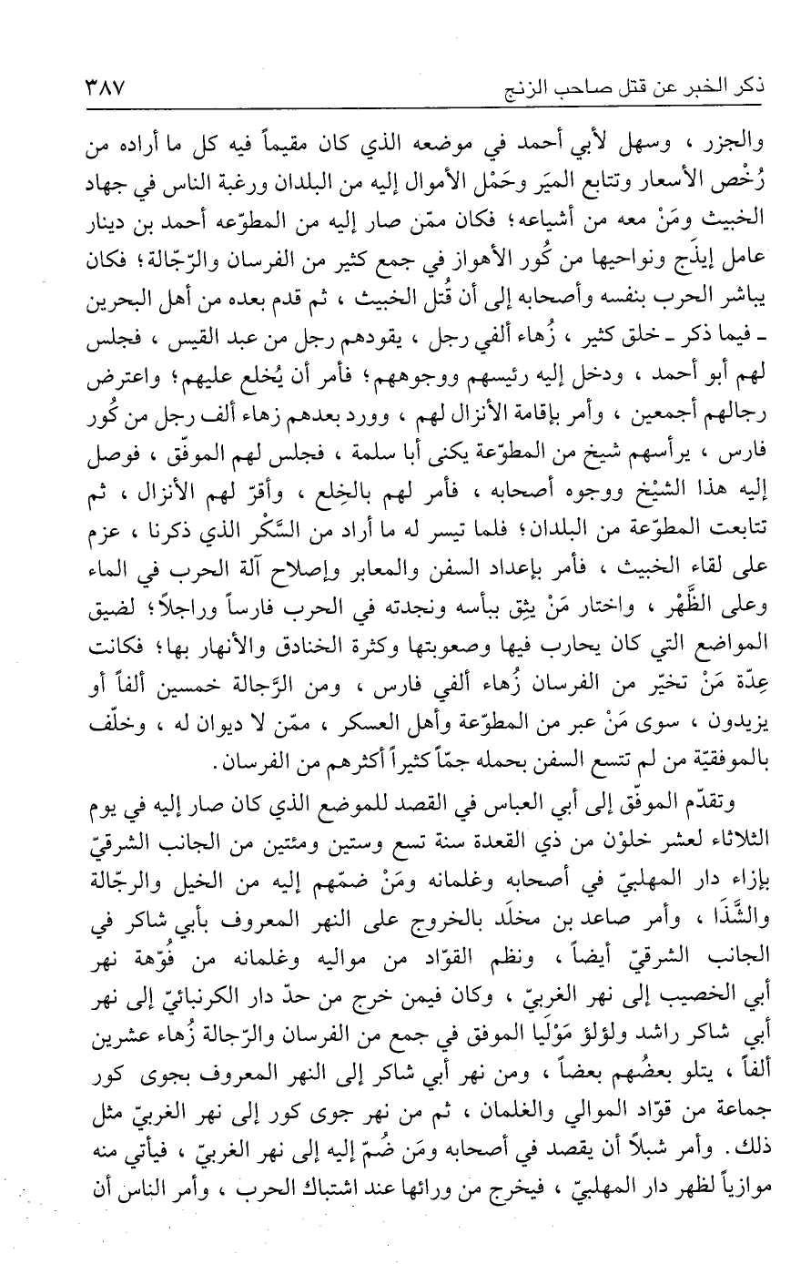 والجزر، وسهل لأبي أحمد في موضعه الذي كان مقيمًا فيه كل ما أراده من رُخْص الأسعار وتتابع الميَر وحَمْل الأموال إليه من البلدان ورغبة الناس في جهاد الخبيث ومَنْ معه من أشياعه؛ فكان ممّن صار إليه من المطوّعه أحمد بن دينار عامل إيذَج ونواحيها من كُور الأهواز في جمع كثير من الفرسان والرّجّالة؛ فكان يباشر الحرب بنفسه وأصحابه إلى أن قُتل الخبيث، ثم قدم بعده من أهل البحرين - فيما ذكر - خلق كثير، زُهاء ألفي رجل، يقودهم رجل من عبد القيس، فجلس لهم أبو أحمد، ودخل إليه رئيسهم ووجوههم؛ فأمر أن يُخلع عليهم؛ واعترض رجالهم أجمعين، وأمر بإقامة الأنزال لهم، وورد بعدهم زهاء ألف رجل من كُور فارس، يرأسهم شيخ من المطوّعة يكنى أبا سلمة، فجلس لهم الموفّق، فوصل إليه هذا الشيْخ ووجوه أصحابه، فأمر لهم بالخِلع، وأقرّ لهم الأنزال، ثم تتابعت المطوّعة من البلدان؛ فلما تيسر له ما أراد من السَّكْر الذي ذكرنا، عزم على لقاء الخبيث، فأمر بإعداد السفن والمعابر وإصلاح آلة الحرب في الماء وعلى الظَّهْر، واختار مَنْ يثِق ببأسه ونجدته في الحرب فارسًا وراجلًا؛ لضيق المواضع التي كان يحارب فيها وصعوبتها وكثرة الخنادق والأنهار بها؛ فكانت عِدّة مَنْ تخيّر من الفرسان زُهاء ألفي فارس، ومن الرَّجالة خمسين ألفًا أو يزيدون، سوى مَنْ عبر من المطوّعة وأهل العسكر، ممّن لا ديوان له، وخلّف بالموفقيّة من لم تتسع السفن بحمله جمًّا كثيرًا أكثرهم من الفرسان.