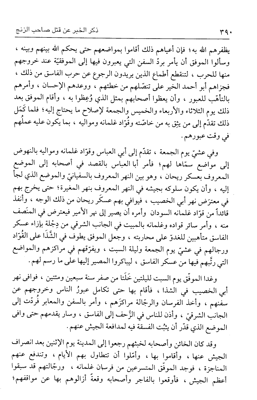 وغدا الموفّق يوم السبت لليلتين خَلَتا من صفر سنة سبعين ومئتين، فوافى نهر أبي الخصيب في الشذا، فأقام بها حتى تكامل عبورُ الناس وخروجهم عن سفنهم، وأخذ الفرسان والرخالة مراكزَهم، وأمر بالسفن والمعابر فُردّت إلى الجانب الشرقيّ، وأذن للناس في الزحف إلى الفاسق، وسار يقدمهم حتى وافى الموضع الذي قدّر أن يثبُت الفسقة فيه لمدافعة الجيش عنهم.