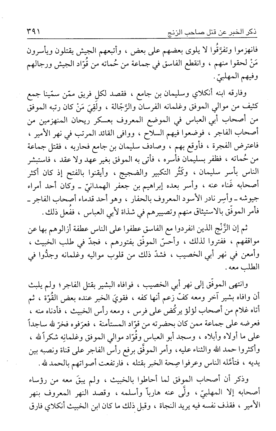 وذكر أن أصحاب الموفّق لما أحاطوا بالخبيث، ولم يبقَ معه من رؤساء أصحابه إلا المهلبيّ، ولَّى عنه هاربًا وأسلمه، وقصد النهر المعروف بنهر الأمير، فقذف نفسه فيه يريد النجاة، وقبل ذلك ما كان ابن الخبيث أنكلاي فارق
