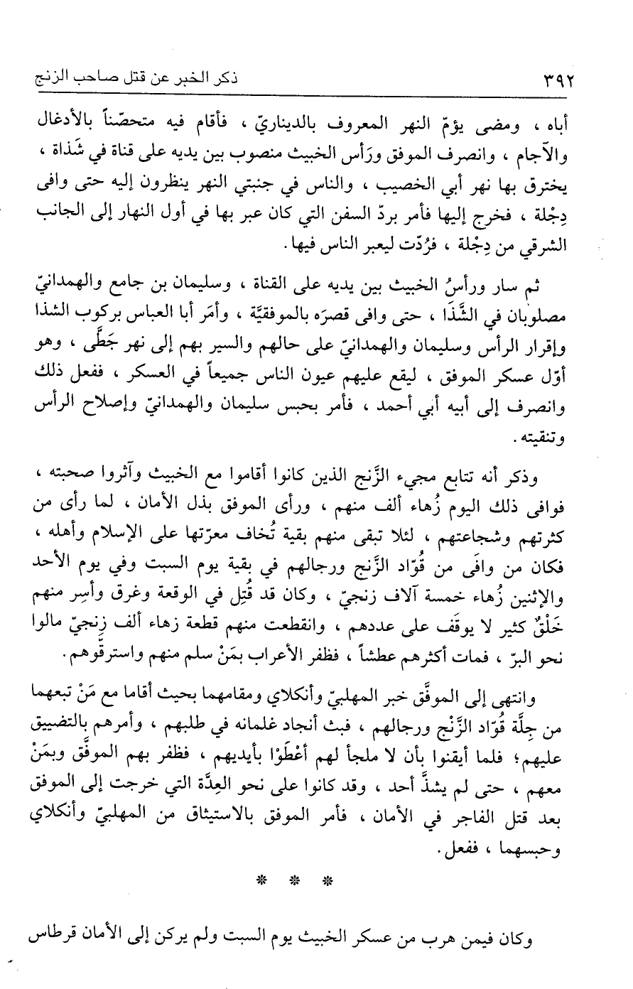 أباه، ومضى يؤمّ النهر المعروف بالديناريّ، فأقام فيه متحصّنًا بالأدغال والآجام، وانصرف الموفّق ورَأس الخبيث منصوب بين يديه على قناة في شَذاة، يخترق بها نهر أبي الخصيب، والناس في جنبتي النهر ينظرون إليه حتى وافى دِجْلة، فخرج إليها فأمر بردّ السفن التي كان عبر بها في أول النهار إلى الجانب الشرقي من دِجْلة، فرُدّت ليعبر الناس فيها.