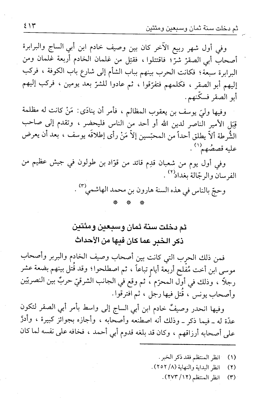 فمن ذلك الحرب التي كانت بين أصحاب وصيف الخادم والبربر وأصحاب موسى ابن أخت مُفْلح أربعة أيامٍ تباعًا، ثم اصطلحوا؛ وقد قُتل بينهم بضعة عشر رجلًا، وذلك في أول المحرّم، ثم وقع في الجانب الشرقيّ حرب بين النصريّين وأصحاب يونس، قُتل فيها رجل، ثم افترقوا.