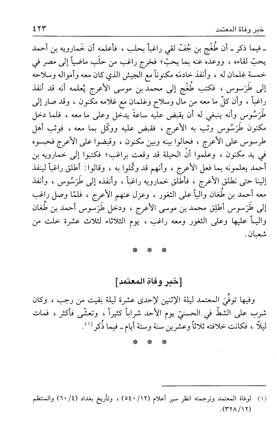 (١) لوفاة المعتمد وترجمته انظر سير أعلام (١٢/ ٥٤٠)، وتأريخ بغداد (٤/ ٦٠) والمنتظم (١٢/ ٣٢٨).