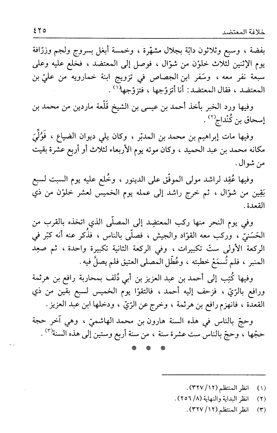 وفي يوم النحر منها ركب المعتضِد إلى المصلّى الذي اتخذه بالقرب من الحَسَنيّ، وركب معه القوّاد والجيش، فصلّى يالناس، فذُكر عنه أنه كبّر في الركعة الأولى ستّ تكبيرات، وفي الركعة الثانية تكبيرة واحدة، ثم صعِد المنبر، فلم تُسمَعْ خطبته، وعُطّل المصلى العتيق فلم يصلّ فيه.