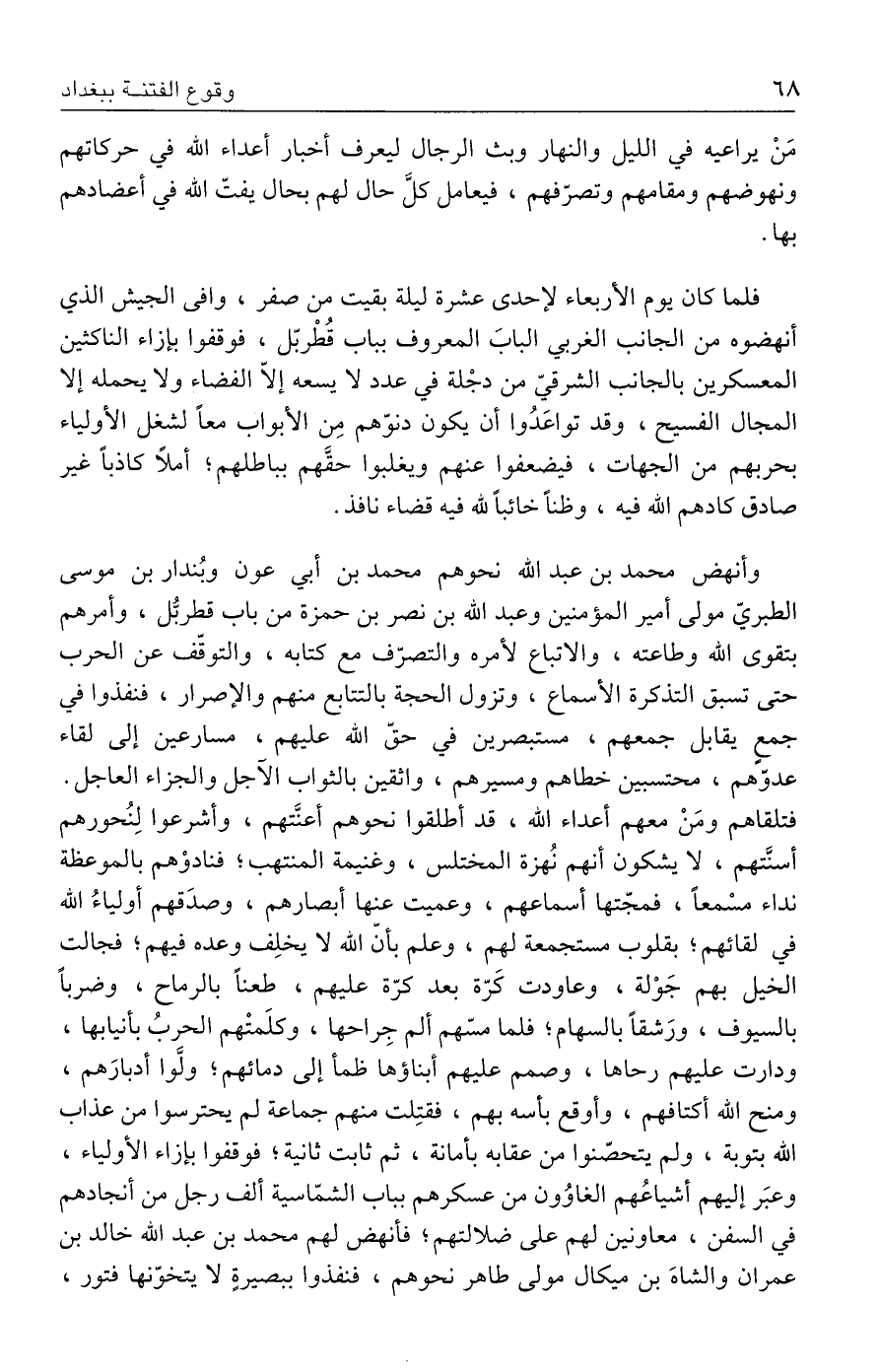 وأنهض محمد بن عبد الله نحوهم محمد بن أبي عون وبُندار بن موسى الطبريّ مولى أمير المؤمنين وعبد الله بن نصر بن حمزة من باب قطربُّل، وأمرهم بتقوى الله وطاعته، والاتباع لأمره والتصرّف مع كتابه، والتوقّف عن الحرب حتى تسبق التذكرة الأسماع، وتزول الحجة بالتتابع منهم والإصرار، فنفذوا في جمعٍ يقابل جمعهم، مستبصرين في حقّ الله عليهم، مسارعين إلى لقاء عدوّهم، محتسبين خطاهم ومسيرهم، واثقين بالثواب الآجل والجزاء العاجل. فتلقاهم ومَنْ معهم أعداء الله، قد أطلقوا نحوهم أعنَّتهم، وأشرعوا لِنُحورهم أسنَتهم، لا يشكون أنهم نُهزة المختلس، وغنيمة المنتهب؛ فنادوْهم بالموعظة نداء مسْمعًا، فمجّتها أسماعهم، وعميت عنها أبصارهم، وصدَقهم أولياءُ الله في لقائهم؛ بقلوب مستجمعة لهم، وعلم بأنّ الله لا يخلِف وعده فيهم؛ فجالت الخيل بهم جَوْلة، وعاودت كَرّة بعد كرّة عليهم، طعنًا بالرماح، وضربًا بالسيوف، ورَشقًا بالسهام؛ فلما مسّهم ألم جِراحها، وكلَمتْهم الحربُ بأنيابها، ودارت عليهم رحاها، وصمم عليهم أبناؤها ظمأ إلى دمائهم؛ ولَّوا أدبارَهم، ومنح الله أكتافهم، وأوقع بأسه بهم، فقتِلت منهم جماعة لم يحترسوا من عذاب الله بتوبة، ولم يتحصّنوا من عقابه بأمانة، ثم ثابت ثانية؛ فوقفوا بإزاء الأولياء، وعبَر إليهم أشياعُهم الغاوُون من عسكرهم بباب الشمّاسية ألف رجل من أنجادهم في السفن، معاونين لهم على ضلالتهم؛ فأنهض لهم محمد بن عبد الله خالد بن عمران والشاهَ بن ميكال مولى طاهر نحوهم، فنفذوا ببصيرةٍ لا يتخوّنها فتور،