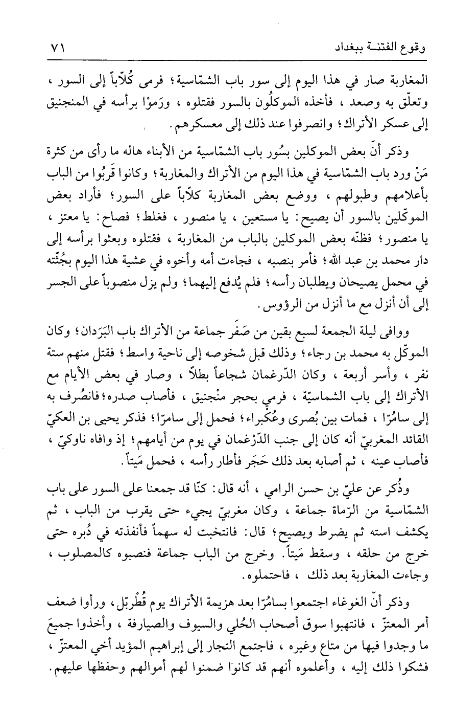 وذكر أنّ بعض الموكلين بسُور باب الشمّاسية من الأبناء هاله ما رأى من كثرة مَنْ ورد باب الشمّاسية في هذا اليوم من الأتراك والمغاربة؛ وكانوا قَربُوا من الباب بأعلامهم وطبولهم، ووضع بعض المغاربة كلّابًا على السور؛ فأراد بعض الموكّلين بالسور أن يصيح: يا مستعين، يا منصور، فغلط، فصاح: يا معتز، يا منصور؛ فظنّه بعض الموكلين بالباب من المغاربة، فقتلوه وبعثوا برأسه إلى دار محمد بن عبد الله؛ فأمر بنصبه، فجاءت أمه وأخوه في عشية هذا اليوم بجُثّته في محمل يصيحان ويطلبان رأسه، فلم يُدفع إليهما؛ ولم يزل منصوبًا على الجسر إلى أن أنزل مع ما أنزل من الرؤوس.