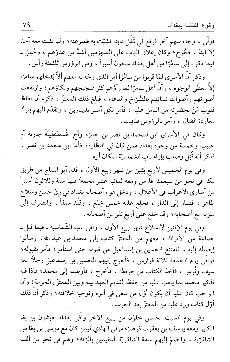 فولّى، وجاء سهم آخر فوقع في كَفَل دابته فشبّت به فصرعته؛ ولم يثبت معه أحد إلَّا ابنهَ، فجُرح، وكان إغلاق الباب على المنهزمين أشدَّ من عدوّهم، وحُمِل - فيما ذكر - إلى سامُرّا من أهل بغداد سبعون أسيرًا، ومن الرؤوس ثلثمئة رأس.