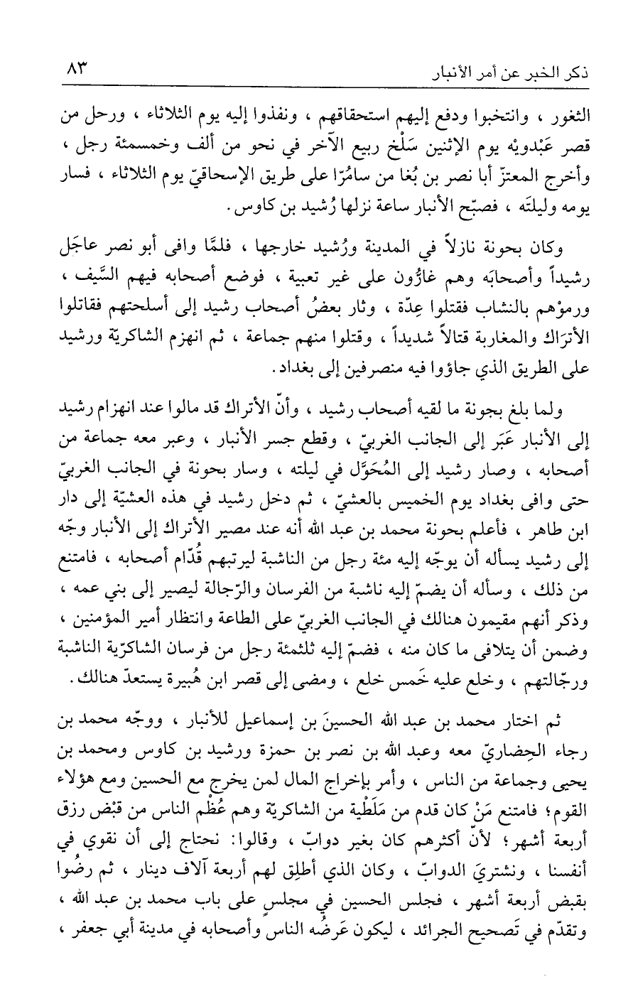 ثم اختار محمد بن عبد الله الحسينَ بن إسماعيل للأنبار، ووجّه محمد بن رجاء الحِضاريّ معه وعبد الله بن نصر بن حمزة ورشيد بن كاوس ومحمد بن يحيى وجماعة من الناس، وأمر بإخراج المال لمن يخرج مع الحسين ومع هؤلاء القوم؛ فامتنع مَنْ كان قدم من مَلَطْية من الشاكريّة وهم عُظْم الناس من قبْض رزق أربعة أشهر؛ لأنّ أكثرهم كان بغير دوابّ، وقالوا: نحتاج إلى أن نقوي في أنفسنا، ونشتريَ الدوابّ، وكان الذي أطلِق لهم أربعة آلاف دينار، ثم رضوا بقبض أربعة أشهر، فجلس الحسين في مجلسٍ على باب محمد بن عبد الله، وتقدّم في تَصحيح الجرائد، ليكون عَرضه الناس وأصحابه في مدينة أبي جعفر،