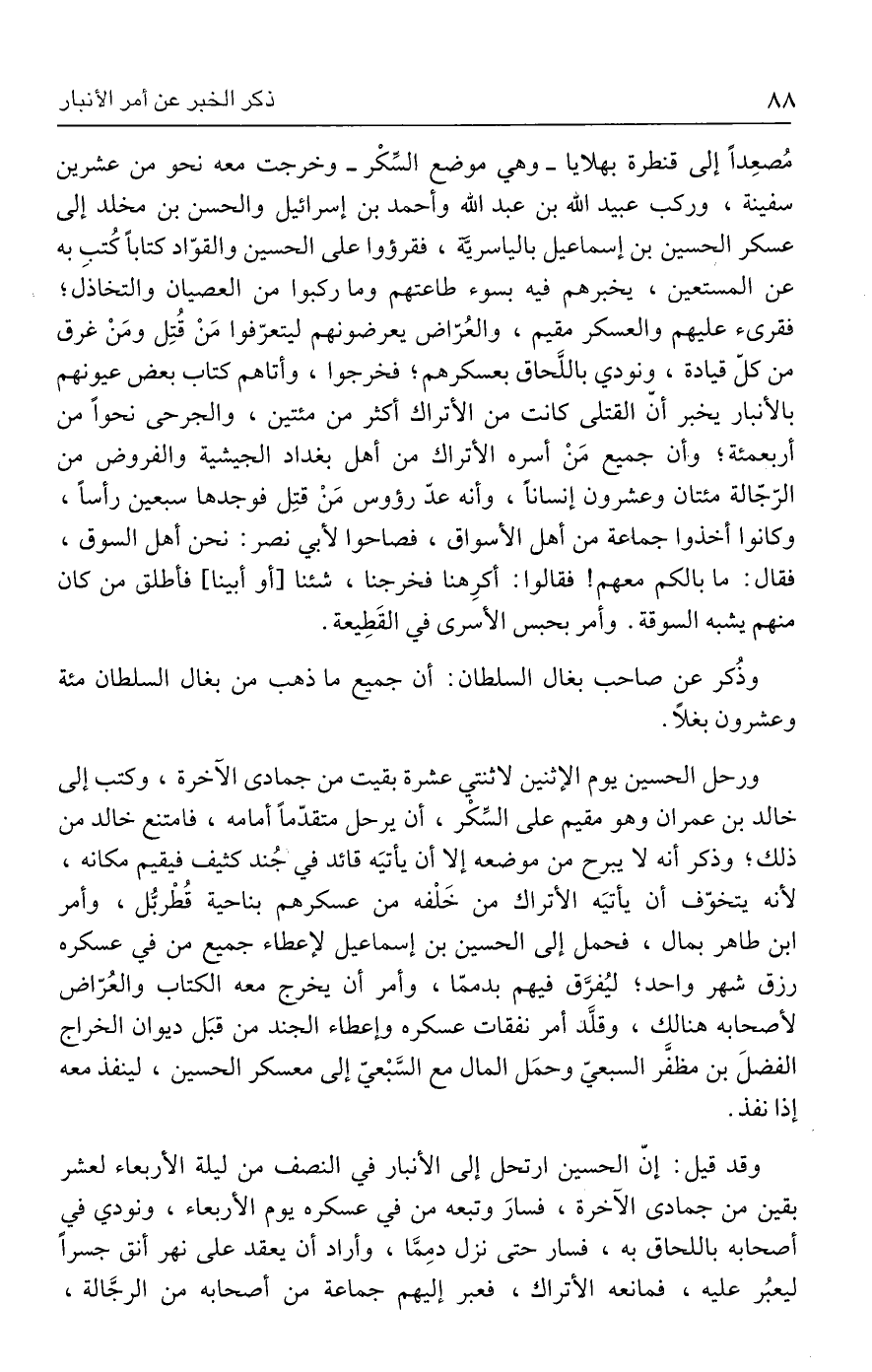 مُصعِدًا إلى قنطرة بهلايا - وهي موضع السِّكْر - وخرجت معه نحو من عشرين سفينة، وركب عبيد الله بن عبد الله وأحمد بن إسرائيل والحسن بن مخلد إلى عسكر الحسين بن إسماعيل بالياسريّة، فقرؤوا على الحسين والموّاد كتابًا كُتبِ به عن المستعين، يخبرهم فيه بسوء طاعتهم وماركبوا من العصيان والتخاذل؛ فقرئ عليهم والعسكر مقيم، والعُرَّاض يعرضونهم ليتعرّفوا مَنْ قُتِل ومَنْ غرق من كل قيادة، ونودي باللَّحاق بعسكرهم، فخرجوا، وأتاهم كتاب بعض عيونهم بالأنبار يخبر أنّ القتلى كانت من الأتراك أكثر من مئتين، والجرحى نحوًا من أربعمئة؛ وأن جميع مَنْ أسره الأتراك من أهل بغداد الجيشية والفروض من الرَّجّالة مئتان وعشرون إنسانًا، وأنه عدّ رؤوس مَنْ قتِل فوجدها سبعين رأسًا، وكانوا أخذوا جماعة من أهل الأسواق، فصاحوا لأبي نصر: نحن أهل السوق، فقال: ما بالكم معهم! فقالوا: أكرِهنا فخرجنا، شئنا [أو أبينا] فأطلق من كان منهم يشبه السوقة. وأمر بحبس الأسرى في القَطِيعة.