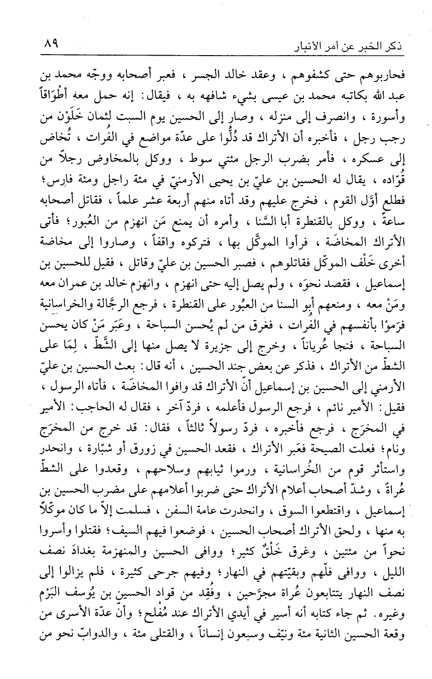 فحاربوهم حتى كشفوهم، وعقد خالد الجسر، فعبر أصحابه ووجّه محمد بن عبد الله بكاتبه محمد بن عيسى بشيء شافهه به، فيقال: إنه حمل معه أطْوَاقًا وأسورة، وانصرف إلى منزله، وصار إلى الحسين يوم السبت لثمان خَلَوْن من رجب رجل، فأخبره أن الأتراك قد دُلُّوا على عدّة مواضع في الفرات، تُخاض إلى عسكره، فأمر بضرب الرجل مئتي سوط، ووكل بالمخاوض رجلًا من قُوّاده، يقال له الحسين بن عليّ بن يحيى الأرمنيّ في مئة راجل ومئة فارس؛ فطلع أوَّل القوم، فخرج عليهم وقد أتاه منهم أربعة عشر علمًا، فقاتل أصحابه ساعةً، ووكل بالقنطرة أبا السَّنا، وأمره أن يمنع مَن انهزم من العُبور؛ فأتى الأتراك المخاضَة، فرأوا الموكَّل بها، فتركوه واقفًا، وصاروا إلى مخاضة أخرى خَلْف الموكّل فقاتلوهم، فصبر الحسين بن عليّ وقاتل، فقيل للحسين بن إسماعيل، فقصد نحوَه، ولم يصل إليه حتى انهزم، وانهزم خالد بن عمران معه ومَنْ معه، ومنعهم أبو السنا من العبُور على القنطرة، فرجع الرجَّالة والخزاسانية فرَموْا بأنفسهم في الفرات، فغرق من لم يُحسن السباحة، وعَبَر مَنْ كان يحسن السباحة، فنجا عُريانًا، وخرج إلى جزيرة لا يصل منها إلى الشَّطّ، لِمَا على الشطّ من الأتراك، فذكر عن بعض جند الحسين، أنه قال: بعث الحسين بن عليّ الأرمني إلى الحسين بن إسماعيل أنّ الأتراك قد وافوا المخاضَة، فأتاه الرسول، فقيل: الأمير نائم، فرجع الرسول فأعلمه، فردّ آخر، فقال له الحاجب: الأمير في المخرَج، فرجع فأخبره، فردّ رسولًا ثالثًا، فقال: قد خرج من المخرَج ونام؛ فعلت الصيحة فعَبر الأتراك، فقعد الحسين في زورق أو شبّارة، وانحدر واستأثر قوم من الخُراسانية، ورموا ثيابهم وسلاحهم، وقعدوا على الشطّ عُراةً، وشدّ أصحاب أعلام الأتراك حتى ضربوا أعلامهم على مضرب الحسين بن إسماعيل، واقتطعوا السوق، وانحدرت عامة السفن، فسلمت إلَّا ما كان موكّلًا به منها، ولحق الأتراك أصحاب الحسين، فوضعوا فيهم السيف؛ فقتلوا وأسروا نحوًا من مئتين، وغرق خَلْقٌ كثير؛ ووافى الحسين والمنهزمة بغدادَ نصف الليل، ووافى فلّهم وبقيّتهم في النهار؛ وفيهم جرحى كثيرة، فلم يزالوا إلى نصف النهار يتتابعون عُراة مجرَّحين، وفُقِد من قواد الحسين بن يوسف اليَرْم وغيره. ثم جاء كتابه أنه أسير في أيدي الأتراك عند مُفْلح؛ وأنَّ عدّة الأسرى من وقعة الحسين الثانية مئة ونيّف وسبعون إنسانًا، والقتلى مئة، والدوابّ نحو من