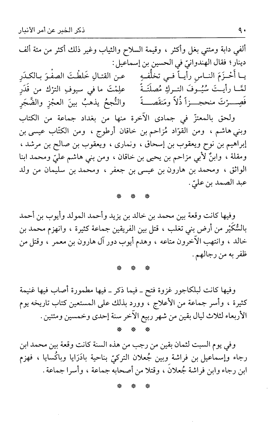 ألفي دابة ومئتي بغل وأكثر، وقيمة السلاح والثياب وغير ذلك أكثر من مئة ألف دينار؛ فقال الهندوانيّ في الحسين بن إسماعيل: