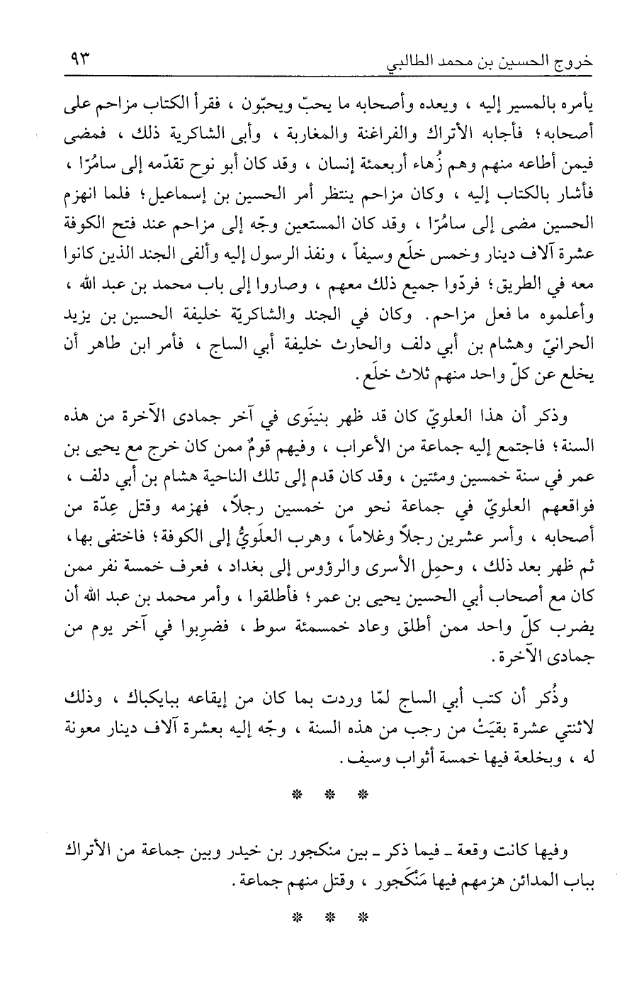 وذكر أن هذا العلويّ كان قد ظهر بنينَوى في آخر جمادى الآخرة من هذه السنة؛ فاجتمع إليه جماعة من الأعراب، وفيهم قومٌ ممن كان خرج مع يحيى بن عمر في سنة خمسين ومئتين، وقد كان قدم إلى تلك الناحية هشام بن أبي دلف، فواقعهم العلويّ في جماعة نحو من خمسين رجلًا، فهزمه وقتل عِدّة من أصحابه، وأسر عشرين رجلًا وغلامًا، وهرب العلَويُّ إلى الكوفة؛ فاختفى بها، ثم ظهر بعد ذلك، وحمِل الأسرى والرؤوس إلى بغداد، فعرف خمسة نفر ممن كان مع أصحاب أبي الحسين يحيى بن عمر؛ فأطلقوا، وأمر محمد بن عبد الله أن يضرب كلّ واحد ممن أطلق وعاد خمسمئة سوط، فضرِبوا في آخر يوم من جمادى الآخرة.