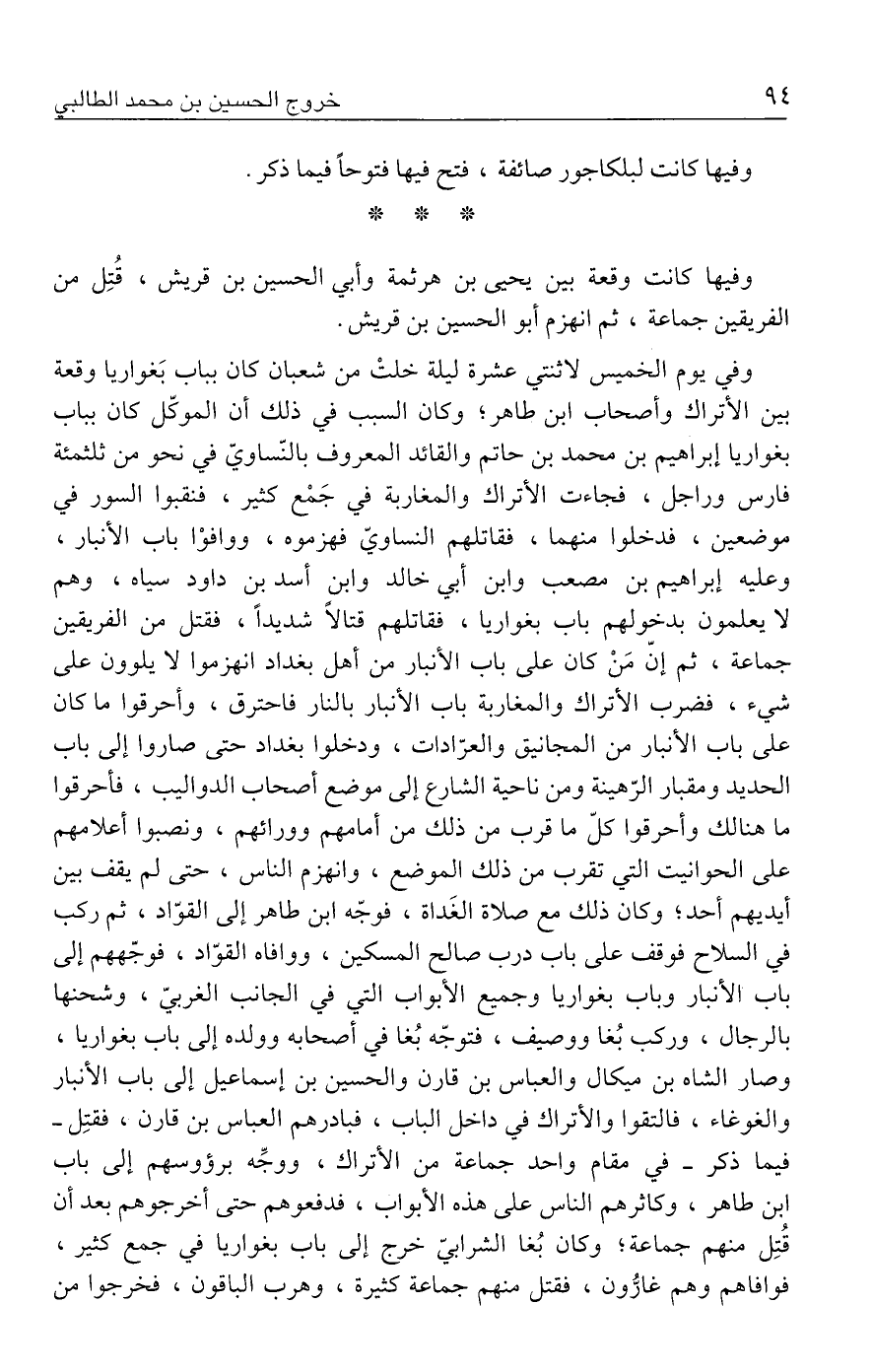 وفيها كانت وقعة بين يحيى بن هرثمة وأبي الحسين بن قريش، قُتِل من الفريقين جماعة، ثم انهزم أبو الحسين بن قريش.