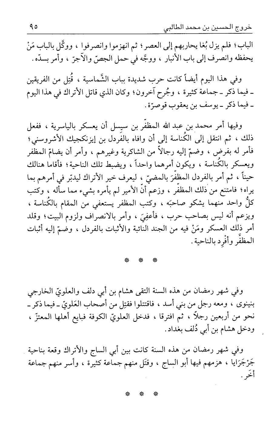 وفي شهر رمضان من هذه السنة التقى هشام بن أبي دلف والعلويّ الخارجي بنينوى، ومعه رجل من بني أسد، فاقتتلوا فقتِل من أصحاب العَلويّ - فيما ذكر - نحو من أربعين رجلًا، ثم افترقا، فدخل العلويّ الكوفة فبايع أهلها المعتزّ، ودخل هشام بن أبي دُلف بغداد.