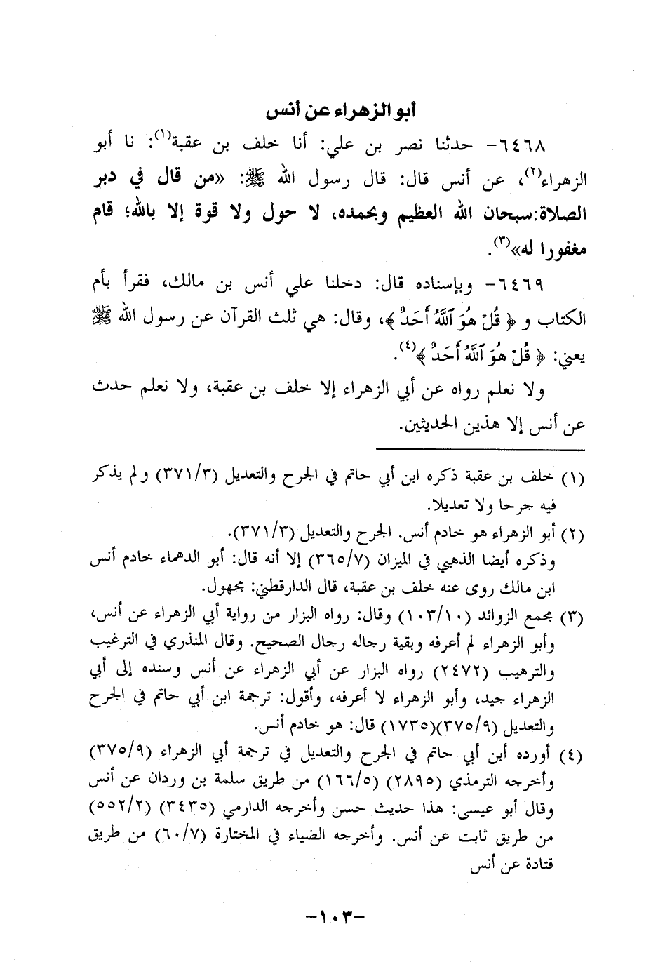 6468- حَدَّثنا نَصْرُ بْنُ علي أخبرنا خلف بن عقبة، حَدَّثنا أَبُو الزَّهْرَاءِ، عَن أَنَسٍ، قَالَ: قَالَ رَسُولُ اللَّهِ صَلَّى اللَّهُ عَلَيْهِ وَسَلَّمَ: مَنْ قَالَ فِي دُبُرِ الصَّلاةِ سُبْحَانَ اللَّهِ الْعَظِيمِ وَبِحَمْدِهِ لا حَوْلَ، ولاَ قُوَّةَ إلاَّ بِاللَّهِ قَامَ مغفورًا له.