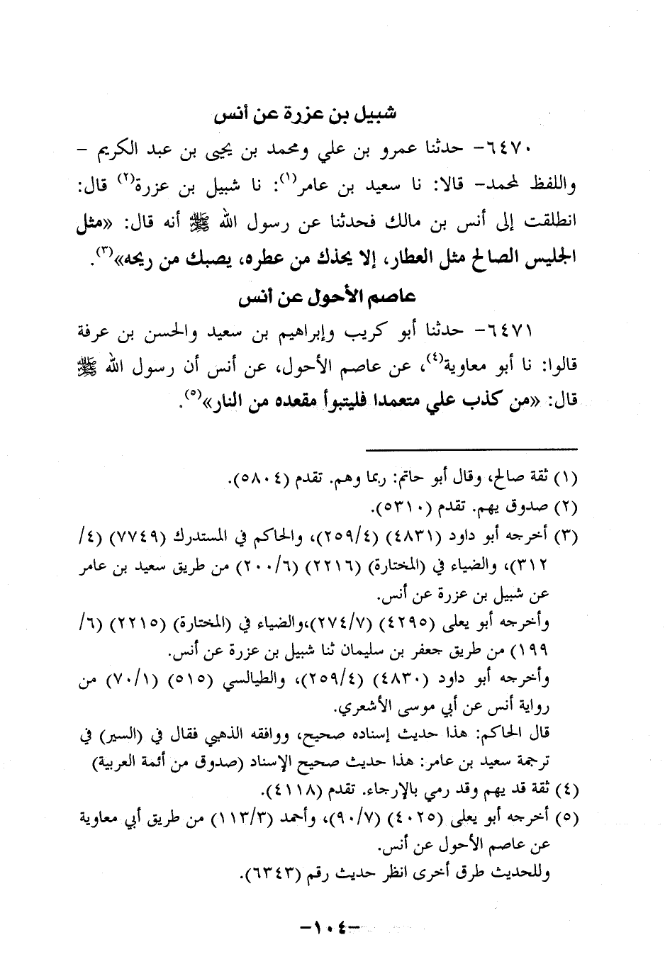 6470- حَدَّثَنا عَمْرُو بْنُ عَلِيٍّ، ومُحَمد بْنُ يَحْيَى بْنِ عَبْدِ الكريم واللفظ لمحمد، قَالاَ: حَدَّثنَا سعيد بن عامر، حَدَّثنا شُبَيْلُ بْنُ عَزْرَةَ قَالَ: انْطَلَقْتُ إِلَى أَنَسِ بْنِ مَالِكٍ فَحَدَّثَنَا عَنْ رَسُولِ اللَّهِ صَلَّى اللَّهُ عَلَيْهِ وَسَلَّمَ أَنَّهُ قَالَ: مَثَلُ الْجَلِيسِ الصَّالِحِ مَثَلُ الْعَطَّارِ إلاَّ يُحْذِكَ مِنْ عِطْرِهِ يصبك ريحه.