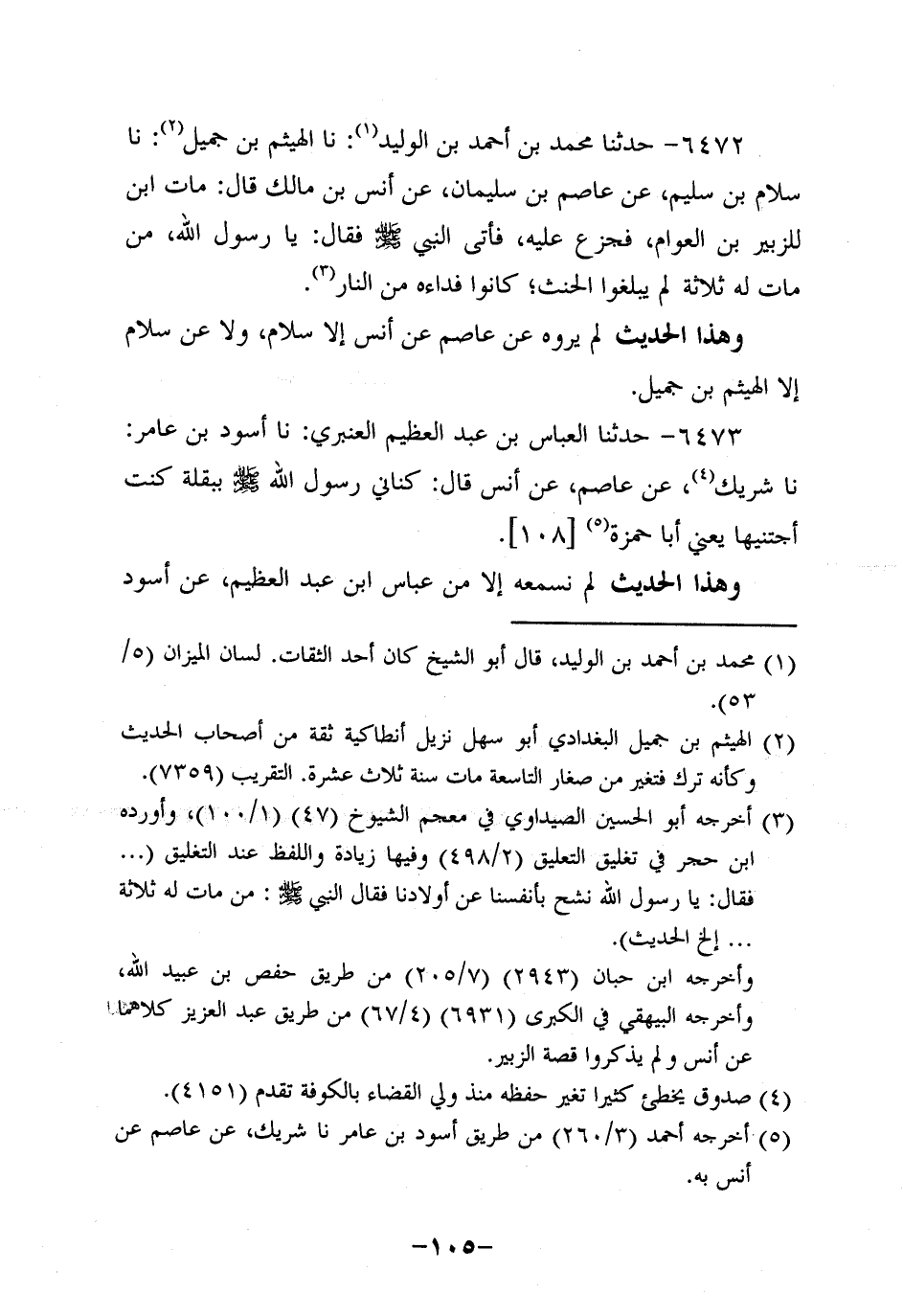 6472- حَدَّثنا محمد بن أحمد بن الوليد، حَدَّثنا الهيثم بن جميل، حَدَّثنا سَلَّامُ بْنُ سُلَيْمٍ , عَنْ عَاصِم بْنِ سُلَيْمَانَ، عَن أَنَس بْنِ مَالِكٍ قَالَ: مَاتَ ابْنٌ لِلزُّبَيْرِ بْنِ الْعَوَّامِ، فَجَزِعَ عَلَيْهِ، فَأَتَى النَّبِيّ صَلَّى اللَّهُ عَلَيْهِ وَسَلَّمَ فَقَالَ: يَا رَسولَ اللهِ، [نشح بأنفسنا عن أولادنا؟ فَقَالَ النَّبِيّ صَلَّى اللَّهُ عَلَيه وَسَلَّم] (1) : مَنْ مَاتَ لَهُ ثلاثةٌ، لَمْ يَبْلُغُوا الْحِنْثَ، كَانُوا فِدَاءَهُ مِنَ النَّارِ.