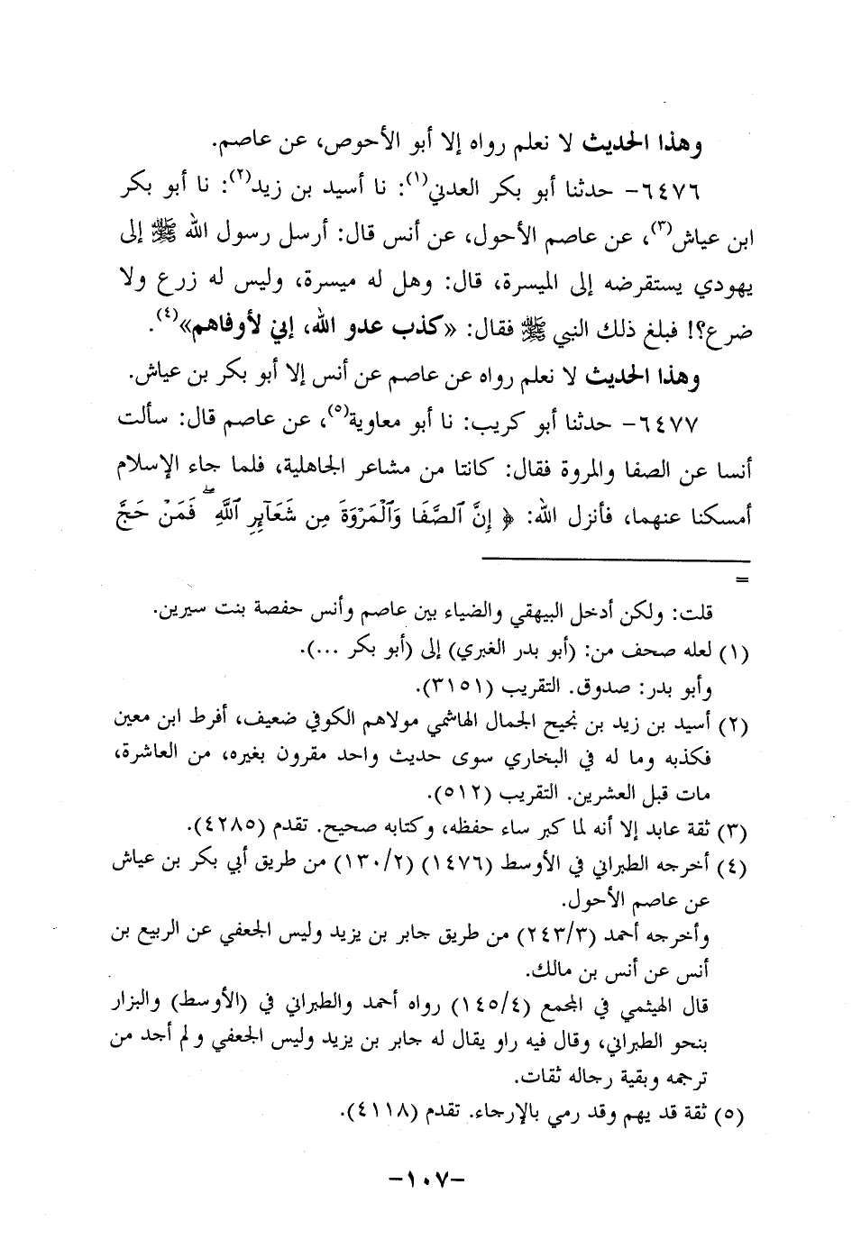 6477- حَدَّثنا أَبُو كُرَيب، حَدَّثنا أَبُو مُعَاوِيَةَ , عَنْ عَاصِم قَالَ: سَأَلْتُ أَنَسًا عَنِ الصَّفَا وَالْمَرْوَةِ فَقَالَ: كَانَتَا مِنْ مَشَاعِرِ الْجَاهِلِيَّةِ فَلَمَّا جَاءَ الإِسْلامُ أَمْسَكْنَا عَنْهُمَا فَأَنْزَلَ اللَّهُ: {إِنَّ الصَّفَا وَالْمَرْوَةَ مِنْ شَعَائِرِ اللَّهِ فَمَنْ حَجَّ الْبَيْتَ، أَوِ اعْتَمَرَ فَلا جُنَاحَ عليه أن يطوف بهما} .