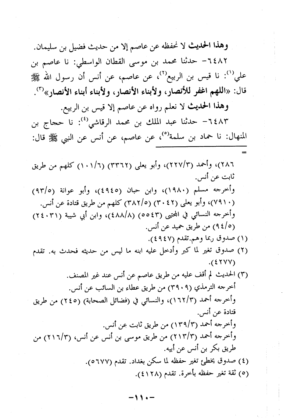 6482- حَدَّثنا محمد بن موسي القطان الواسطي، حَدَّثنا عَاصِم بن علي، حَدَّثنا قَيْسُ بْنُ الرَّبِيعِ , عَنْ عَاصِم، عَن أَنَس؛ أَنَّ رَسُولَ اللَّهِ صَلَّى اللَّهُ عَلَيْهِ وَسَلَّمَ قَالَ: اللَّهُمَّ اغْفِرْ لِلأَنْصَارِ وَلأَبْنَاءِ الأَنْصَارِ وَلأَبْنَاءِ أَبْنَاءِ الأَنْصَارِ.