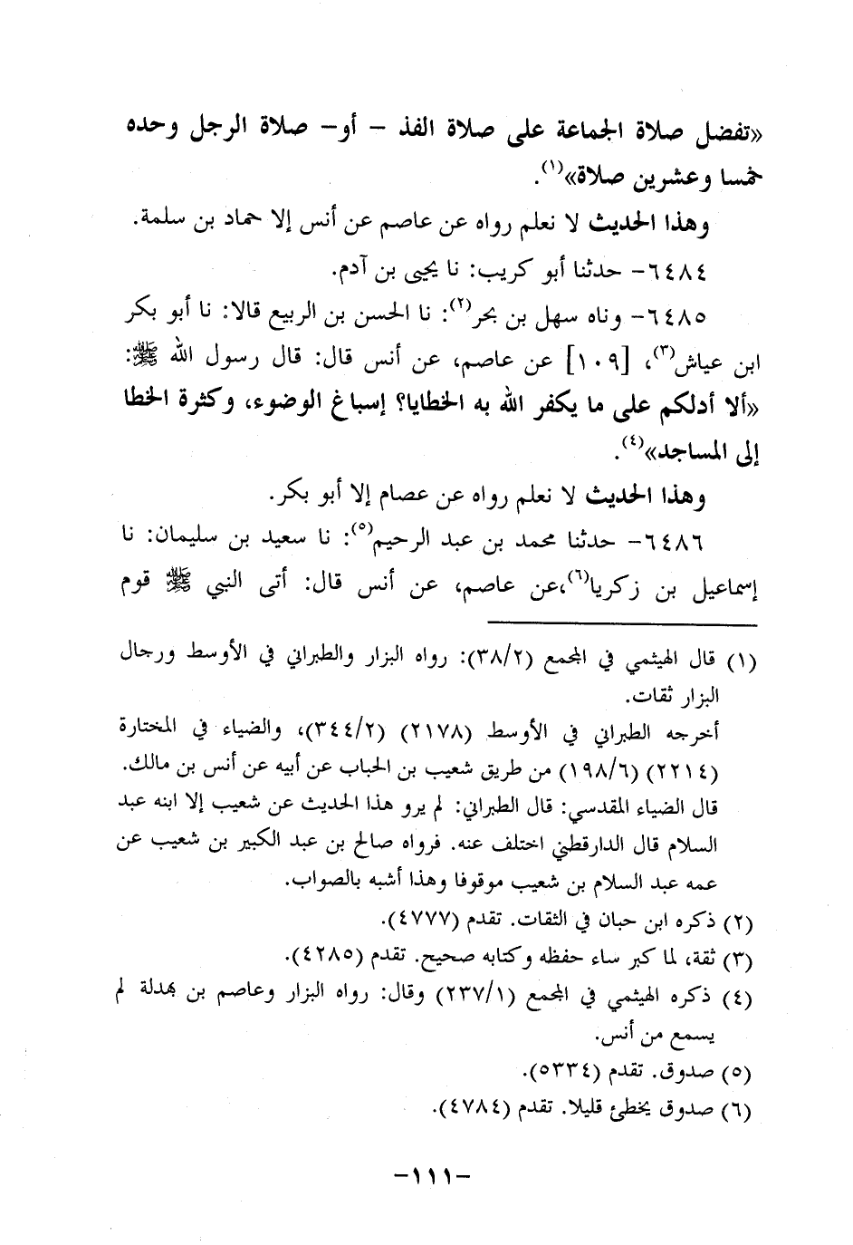6485- وحَدَّثناه سهل بن بحر، حَدَّثنا الحسن بن الربيع، قَالاَ: حَدَّثنَا أَبُو بَكْرِ بْنُ عَيَّاشٍ , عَنْ عَاصِم، عَن أَنَسٍ، قَالَ: قَالَ رَسُولُ اللَّهِ صَلَّى اللَّهُ عَلَيْهِ وَسَلَّمَ: أَلَا أَدُلُّكُمْ عَلَى مَا يُكَفِّرُ اللَّهُ بِهِ الْخَطَايَا؟ إِسْبَاغُ الْوُضُوءِ وَكَثْرَةُ الْخُطَا إِلَى الْمَسَاجِدِ.