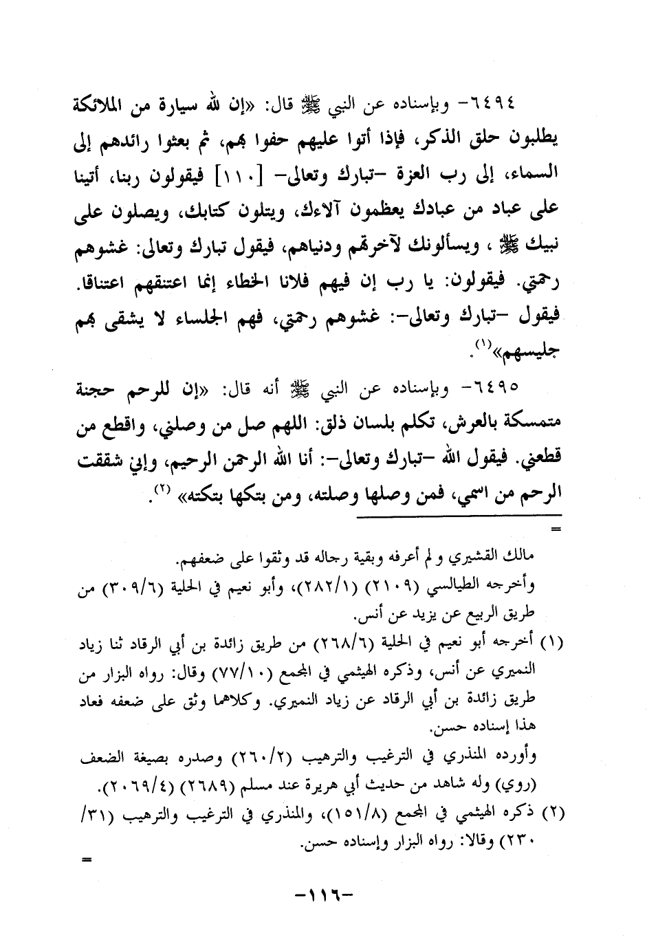 6494- وَبِإِسْنَادِهِ؛ عَنِ النَّبِيّ صَلَّى اللَّهُ عَلَيْهِ وَسَلَّمَ قَالَ: إِنَّ لِلَّهِ سَيَّارَةً مِنَ الْمَلائِكَةِ يَطْلُبُونَ حَلَقَ الذِّكْرِ فَإِذَا أَتَوْا عَلَيْهِمْ حَفُّوا بِهِمْ ثُمَّ بَعَثُوا رَائِدَهُمْ إِلَى السَّمَاءِ إِلَى رَبِّ الْعِزَّةِ تَبَارَكَ وَتَعَالَى فَيَقُولُونَ رَبَّنَا أَتَيْنَا عَلَى عِبَادٍ مِنْ عِبَادِكَ يُعَظِّمُونَ آلاءَكَ وَيَتْلُونَ كِتَابَكَ وَيُصَلُّونَ عَلَى نَبِيِّكَ صَلَّى اللَّهُ عَلَيْهِ وَسَلَّمَ ويسئلونك لآخرتهم وديناهم فَيَقُولُ تَبَارَكَ وَتَعَالَى: غَشُّوهُمْ رَحْمَتِي فَيَقُولُونَ يَا رب إن فيهم فلانا الخطاء إنما أعتقناهم إعتاقا فَيَقُولُ تَبَارَكَ وَتَعَالَى: غَشُّوهُمْ رَحْمَتِي فَهُمُ الْجُلَسَاءُ لا يَشْقَى بِهِمْ جَلِيسُهُمْ.