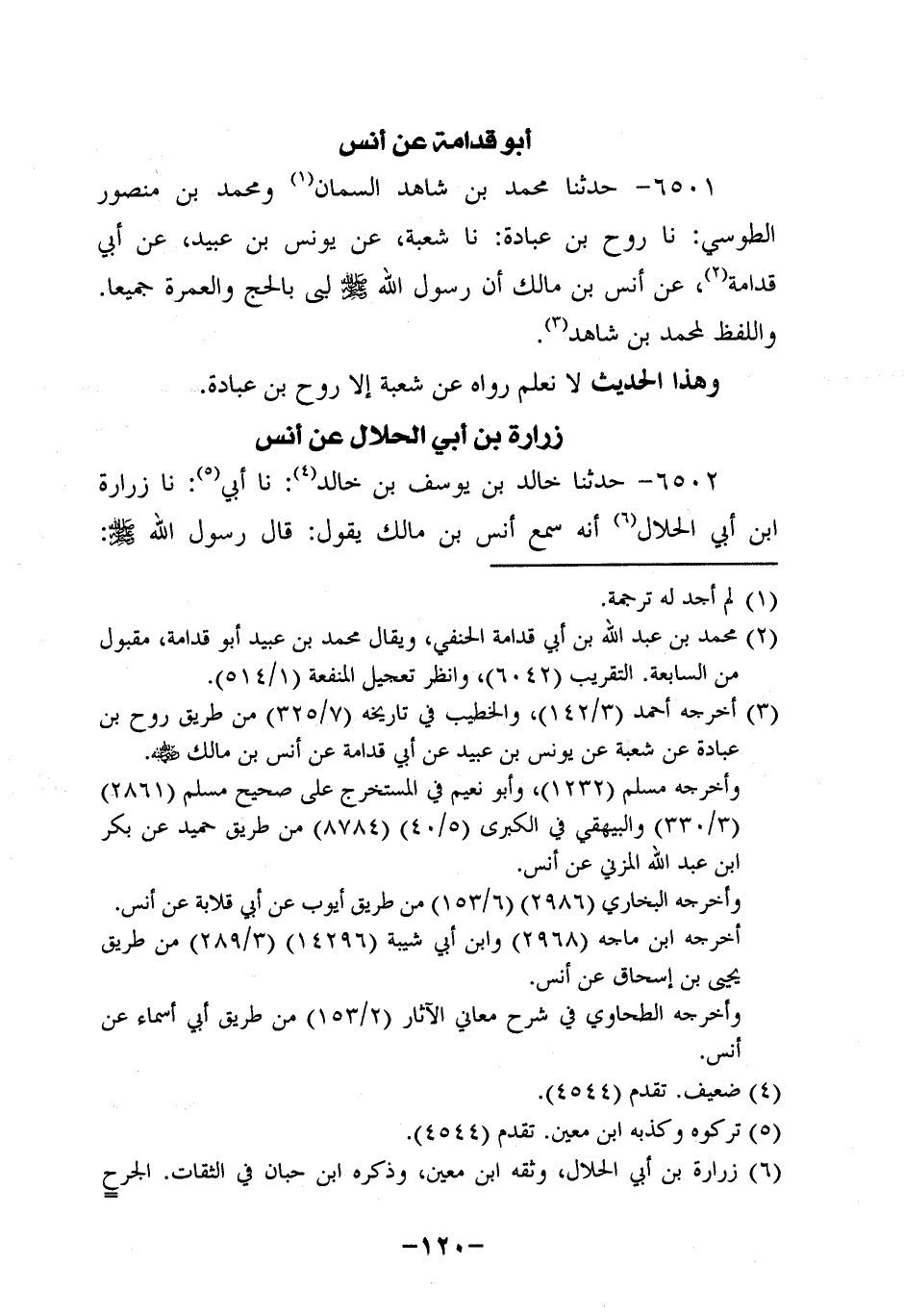 6501- حَدَّثنا مُحَمَّدُ بْنُ شاهد السمان، ومُحَمد بن منصور الطوسي، حَدَّثنا روح بن عبادة، حَدَّثنا شُعْبَةُ , عَنْ يُونُس بْنِ عُبَيد، عَن أَبِي قُدَامَةَ، عَن أَنَس بْنِ مَالِكٍ أَنَّ رَسُولَ اللهِ صَلَّى اللَّهُ عَلَيْهِ وَسَلَّمَ لَبَّى بِالْحَجِّ وَالْعُمْرَةِ جَمِيعًا.