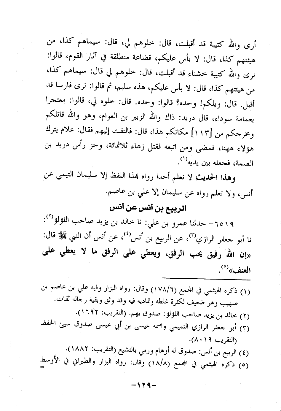 6519- حَدَّثَنا عَمْرُو بْنُ عَلِيٍّ، حَدَّثنا خالد بن يزيد صاحب اللؤلؤ، حَدَّثنا أَبُو جَعْفَرٍ الرَّازِيُّ , عَنِ الرَّبِيعِ بْنِ أَنَسٍ، عَن أَنَس؛ أَنَّ النَّبِيّ صَلَّى اللَّهُ عَلَيْهِ وَسَلَّمَ قَالَ: إِنَّ اللَّهَ رَفِيقٌ يُحِبُّ الرِّفْقَ وَيُعْطِي عَلَى الرِّفْقِ مَا لا يُعْطِي عَلَى العنف.