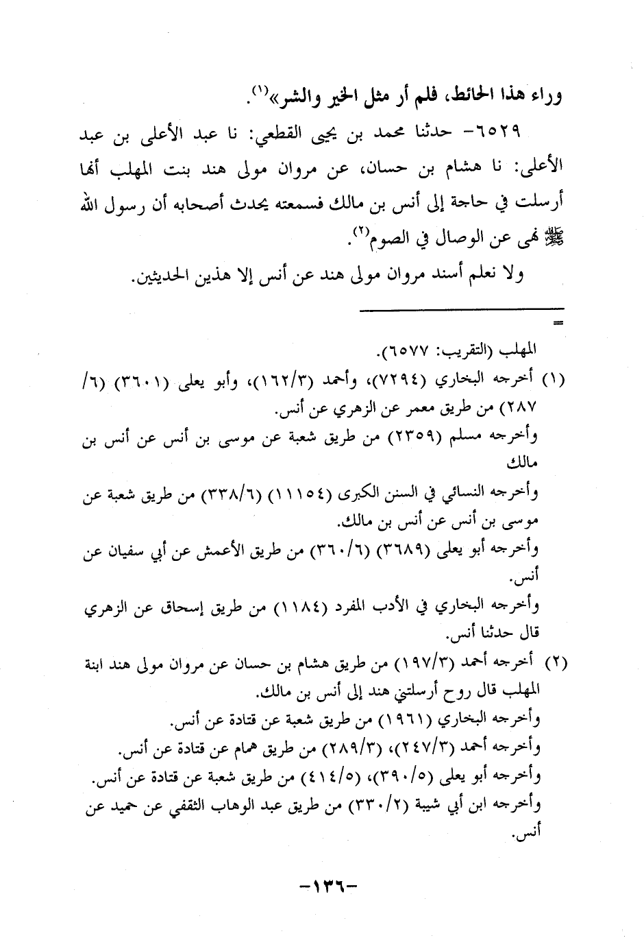 6529- حَدَّثنا محمد بن يحيي القطعي، حَدَّثنا عبد الأعلي بن عبد الأعلي، حَدَّثنا هِشَامُ بْنُ حَسَّانٍ , عَنْ مَرْوَانَ مَوْلَى هِنْدِ بِنْتِ الْمُهَلَّبِ أَنَّهَا أَرْسَلَتْ فِي حَاجَةٍ إِلَى أَنَسِ بْنِ مَالِكٍ فَسَمِعَتْهُ يُحَدِّثُ أَصْحَابَهُ أَنَّ رَسُولَ اللهِ صَلَّى اللَّهُ عَلَيْهِ وَسَلَّمَ نَهَى عَنِ الْوِصَالِ فِي الصَّوْمِ.