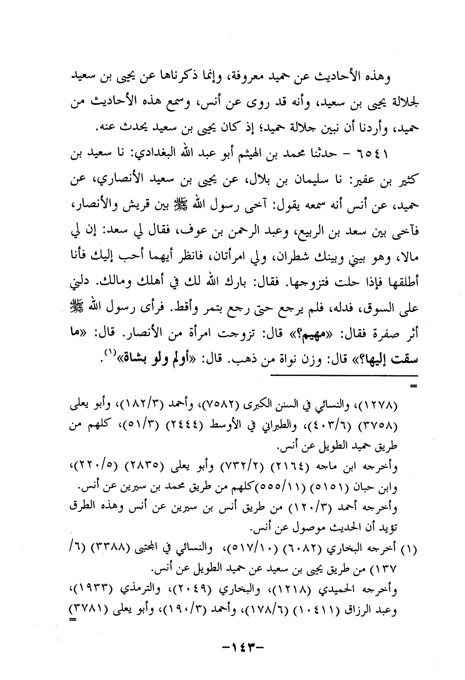 6541- حَدَّثنا مُحَمَّدُ بْنُ الْهَيْثَمِ أَبُو عَبْدِ اللَّهِ البغدادي، حَدَّثنا سعيد بن كثير بن عفير، حَدَّثنا سُلَيْمَانَ بْنِ بِلالٍ، عَن يَحيى بْنِ سَعِيدٍ الأَنْصَارِيِّ , عَنْ حُمَيد، عَن أَنَس؛ أَنَّه سَمِعَهُ يَقُولُ: آخَى رَسُولُ اللَّهِ صَلَّى اللَّهُ عَلَيْهِ وَسَلَّمَ بَيْنَ قُرَيْشٍ وَالأَنْصَارِ فَآخَى بَيْنَ سَعْدِ بْنِ الرَّبِيعِ وَعَبْدِ الرَّحْمَنِ بْنِ عَوْفٍ فَقَالَ لِي سَعْدٌ: إِنَّ لِي مَالا، وهُو بَيْنِي وَبَيْنَكَ شَطْرَانِ وَلِي امْرَأَتَانِ فَانْظُرْ أَيَّهُمَا أَحَبُّ إِلَيْكَ فَأَنَا أُطَلِّقُهَا، فَإِذَا حَلَّتْ فَتَزَوَّجْهَا فَقَالَ: بَارَكَ اللَّهُ لَكَ فِي أَهْلِكَ وَمَالِكَ دُلَّنِي عَلَى السُّوقِ فَدَلَّهُ فَلَمْ يَرْجِعْ حَتَّى رَجَعَ بِتَمْرٍ وَأَقِطٍ فَرَأَى رَسُولُ اللَّهِ صَلَّى اللَّهُ عَلَيْهِ وَسَلَّمَ أَثَرَ صُفْرَةٍ فَقَالَ: مَهْيَمْ؟ قَالَ: تَزَوَّجْتُ امْرَأَةً مِنَ الأَنْصَارِ قَالَ: مَا سُقْتَ إِلَيْهَا؟ قَالَ: وَزْنَ نَوَاةٍ مِنْ ذَهَبٍ قَالَ: أَوْلِمْ، وَلَوْ بِشَاةٍ.