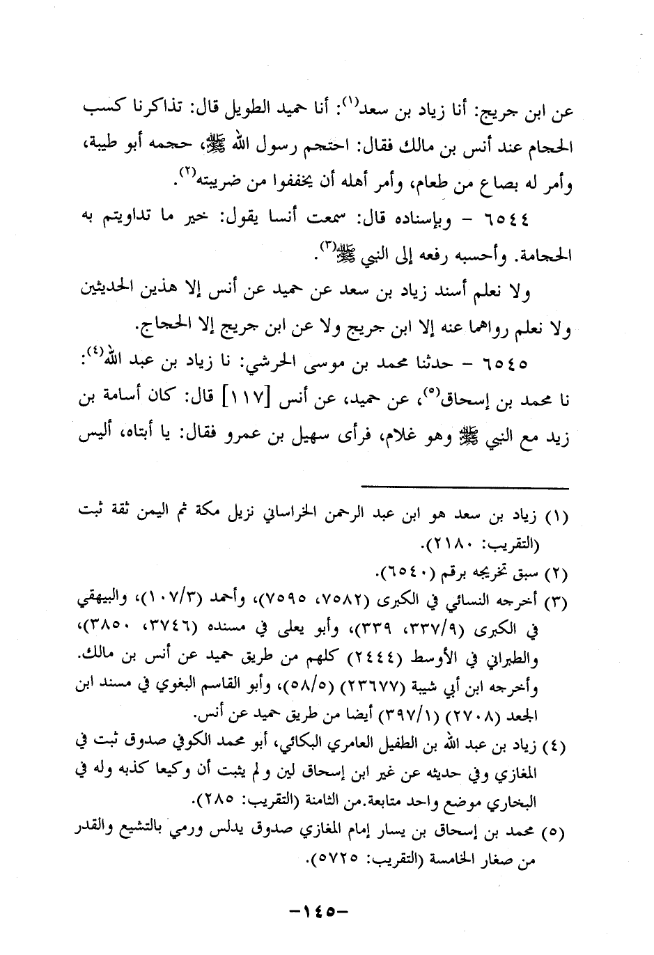 6545- حَدَّثنا محمد بن موسي الحرشي، حَدَّثنا زياد بن عبد الله، حَدَّثنا مُحَمَّدُ بْنُ إِسْحَاقَ , عَنْ حُمَيد، عَن أَنَسٍ، قَالَ: كَانَ أُسَامة بْنُ زَيْدٍ مَعَ النَّبِيّ صَلَّى اللَّهُ عَلَيْهِ وَسَلَّمَ، وهُو غُلامٌ فَرَأَى سُهَيْلَ بْنَ عَمْرو فَقَالَ: يَا أَبَتَاهُ أَلَيْسَ هَذَا الَّذِي كَانَ يُطْعِمُنَا الثَّرِيدَ بِمَكَّةَ؟ فَجَعَلَ النَّبِيّ صَلَّى اللَّهُ عَلَيْهِ وَسَلَّمَ يُعْرِضُ عَنْهُ.