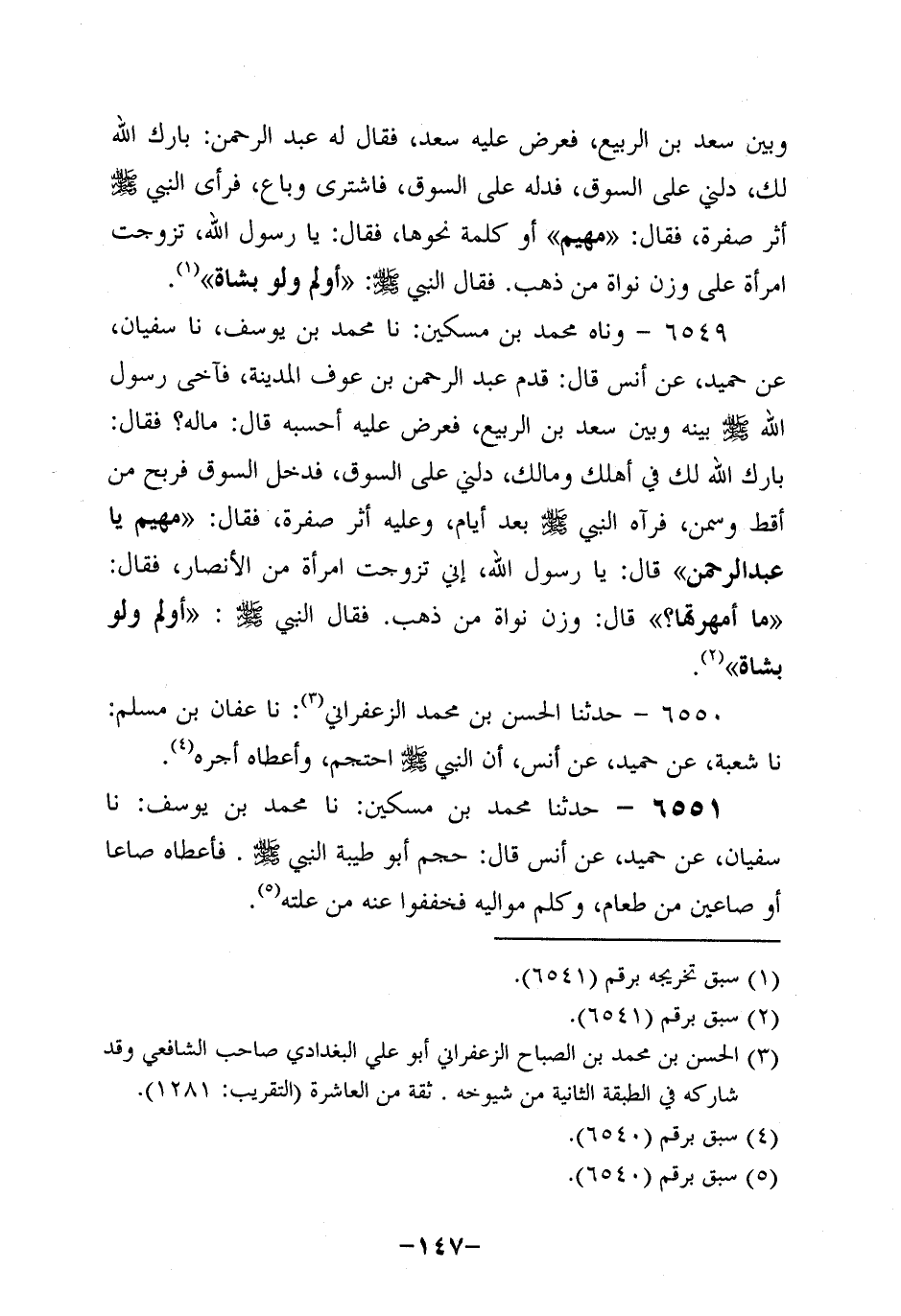 6549- وحَدَّثناه محمد بن مسكين، حَدَّثنا محمد بن يوسف، حَدَّثنا سُفيان، عَن حُمَيد، عَن أَنَسٍ، قَالَ: قَدِمَ عَبْدُ الرَّحْمَنِ بْنُ عَوْفٍ الْمَدِينَةَ فَآخَى رَسُولُ اللَّهِ صَلَّى اللَّهُ عَلَيْهِ وَسَلَّمَ بَيْنَهُ وَبَيْنَ سَعْدِ بْنِ الرَّبِيعِ فَعَرَضَ عَلَيْهِ أَحْسَبُهُ قَالَ: مَالَهُ؟ فَقَالَ: بَارَكَ اللَّهُ لَكَ فِي أَهْلِكَ وَمَالِكَ دُلَّنِي عَلَى السُّوقِ فَدَخَلَ السُّوقَ فَرَبِحَ مِنْ أَقِطٍ وَسَمْنٍ فَرَآهُ النَّبِيّ صَلَّى اللَّهُ عَلَيْهِ وَسَلَّمَ بَعْدَ أَيَّامٍ وَعَلَيْهِ أَثَرُ صُفْرَةٍ فَقَالَ: مَهْيَمْ يَا عَبْدَ الرَّحْمَنِ قَالَ: يَا رَسولَ اللهِ إِنِّي تَزَوَّجْتُ امْرَأَةً مِنَ الأَنْصَارِ فَقَالَ: مَا أَمْهَرْتَهَا؟ قَالَ: وَزْنَ نَوَاةٍ مِنْ ذَهَبٍ فَقَالَ النَّبِيّ صَلَّى اللَّهُ عَلَيْهِ وَسَلَّمَ: أَوْلِمْ، وَلَوْ بِشَاةٍ.