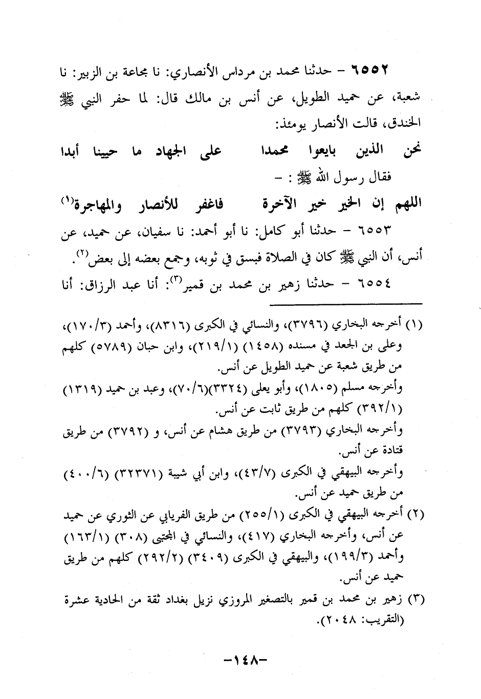 6552- حَدَّثنا محمد بن مرداس الأنصاري، حَدَّثنا مجاعة بن الزبير، حَدَّثنا شُعْبَةُ , عَنْ حُمَيد الطَّوِيلِ، عَن أَنَس بْنِ مَالِكٍ قَالَ: لَمَّا حَفَرَ النَّبِيّ صَلَّى اللَّهُ عَلَيْهِ وَسَلَّمَ الْخَنْدَقَ قَالَتِ الأَنْصَارُ يَوْمَئِذٍ: