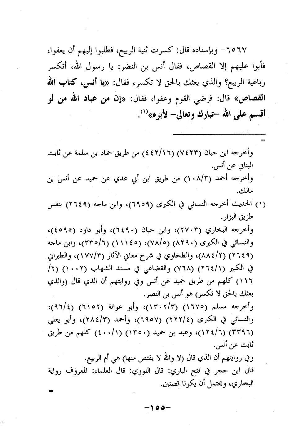 6567- وَبِإِسْنَادِهِ؛ قَالَ: كُسِرَتْ ثَنِيَّةُ الرَّبِيعِ فَطَلَبُوا إِلَيْهِمْ أَنْ يَعْفُوا فَأَبَوْا عَلَيْهِمْ إلاَّ الْقِصَاصَ فَقَالَ أَنَسُ بْنُ النَّضْرِ: يَا رَسولَ اللهِ أَتُكْسَرُ رَبَاعِيَةُ الرَّبِيعِ؟ وَالَّذِي بَعَثَكَ بِالْحَقِّ لا تُكْسَرُ فَقَالَ: يَا أَنَسُ كِتَابُ اللَّهِ الْقِصَاصُ قَالَ: فَرَضِيَ الْقَوْمُ وَعَفَوْا فَقَالَ: إِنَّ مِنْ عِبَادِ اللَّهِ مَنْ لَوْ أَقْسَمَ عَلَى اللَّهِ تَبَارَكَ وَتَعَالَى لأَبَرَّهُ.