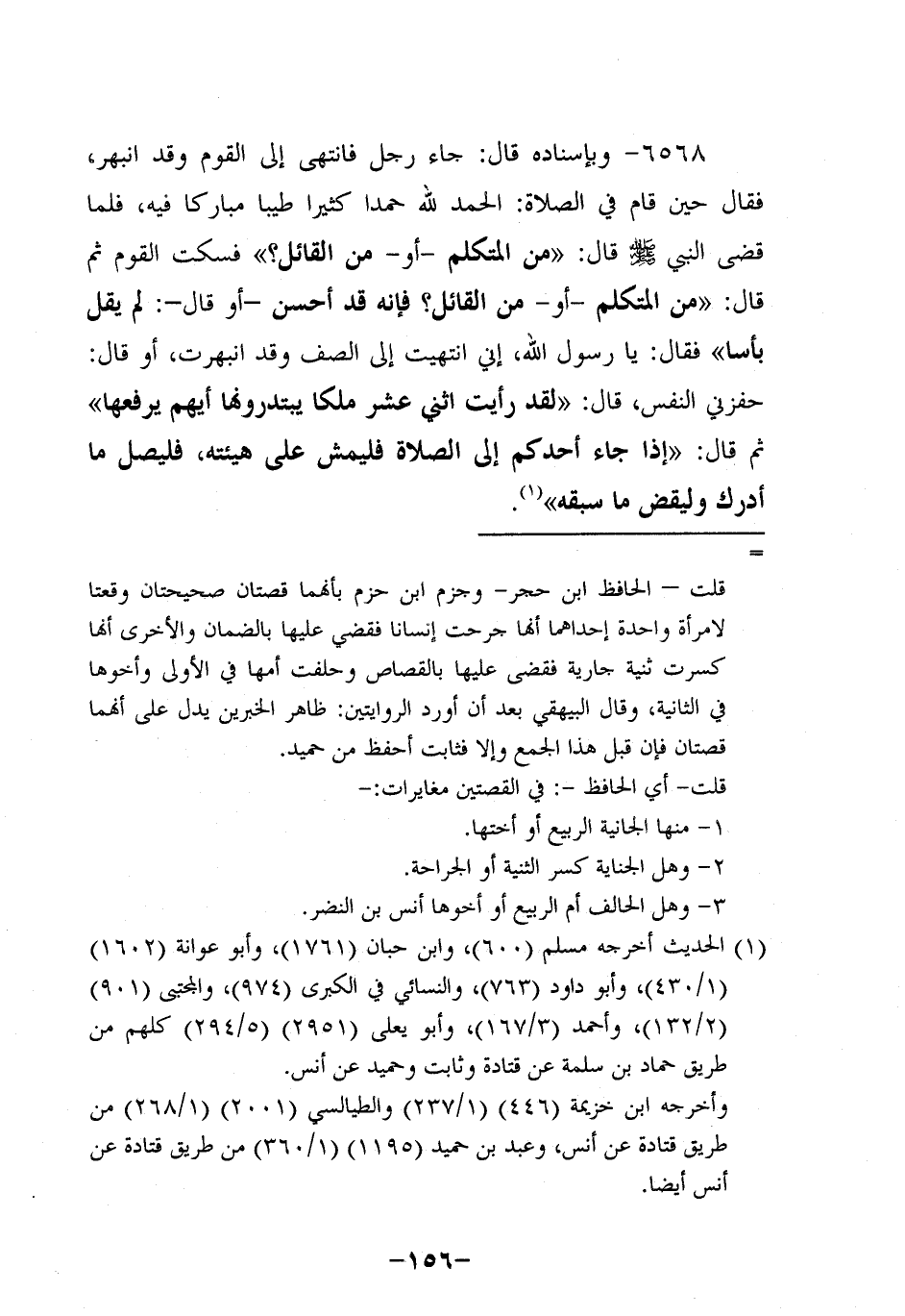 6568- وَبِإِسْنَادِهِ؛ قَالَ: جَاءَ رَجُلٌ فَانْتَهَى إِلَى الْقَوْمِ وَقَدِ انْبَهَرَ فَقَالَ حِينَ قَامَ فِي الصَّلاةِ: الْحَمْدُ لِلَّهِ حَمْدًا كَثِيرًا طَيِّبًا مُبَارَكًا فِيهِ فَلَمَّا قَضَى النَّبِيّ صَلَّى اللَّهُ عَلَيْهِ وَسَلَّمَ قَالَ: مَنِ الْمُتَكَلِّمُ، أَوْ مَنِ الْقَائِلُ؟ فَسَكَتَ الْقَوْمُ، ثُمَّ قَالَ: مَنِ الْمُتَكَلِّمُ، أَوْ مَنِ الْقَائِلُ فَإِنَّهُ قَدْ أَحْسَنَ، أَوْ قَالَ: لَمْ يَقُلْ بَأْسًا فَقَالَ: يَا رَسولَ اللهِ إِنِّي انْتَهَيْتُ إِلَى الصَّفِّ وَقَدِ انْبَهَرْتُ، أَوْ قَالَ حَفَزَنِي النَّفَسُ قَالَ: لَقَدْ رَأَيْتُ اثْنَيْ عَشَرَ مَلَكًا يَبْتَدِرُونَهَا أَيَّهُمْ يَرْفَعُهَا، ثُمَّ قَالَ: إِذَا جَاءَ أَحَدُكُمْ إِلَى الصَّلاةِ فَلْيَمْشِ عَلَى هَيْئَتِهِ فَلْيُصَلِّ مَا أَدْرَكَ وَلْيَقْضِ مَا سَبَقَهُ.