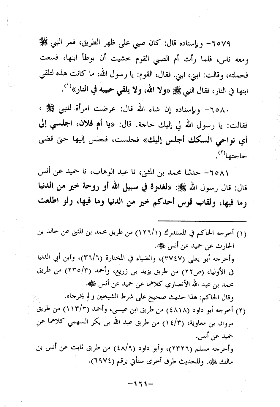 6579- وَبِإِسْنَادِهِ؛ قَالَ: كَانَ صَبِيٌّ عَلَى ظَهْرِ الطَّرِيقِ فَمَرَّ النَّبِيّ صَلَّى اللَّهُ عَلَيْهِ وَسَلَّمَ وَمَعَهُ نَاسٌ فَلَمَّا رَأَتْ أُمُّ الصَّبِيِّ الْقَوْمَ خَشِيَتْ أَنْ يُوطَأَ ابْنُهَا فَسَعَتْ فَحَمَلَتْهُ وَقَالَتْ: ابْنِي ابْنِي فَقَالَ الْقَوْمُ: يَا رَسولَ اللهِ مَا كَانَتْ هَذِهِ لِتُلْقِي ابْنَهَا فِي النَّارِ فَقَالَ النَّبِيّ صَلَّى اللَّهُ عَلَيْهِ وَسَلَّمَ، ولاَ اللَّهُ، ولاَ يُلْقِي حَبِيبَهُ فِي النَّارِ.