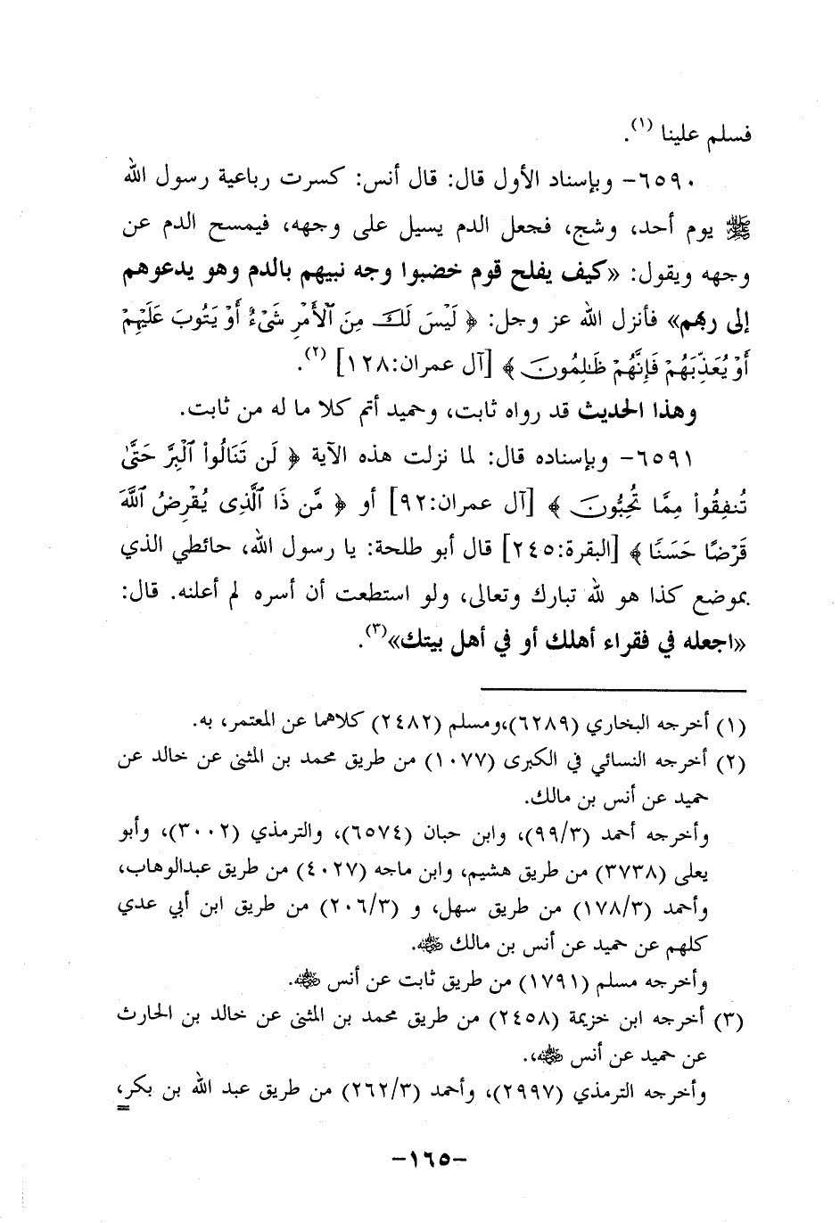 6590 - وَبِإِسْنَادِ الأَوَّلِ (1) ؛ قَالَ: قَالَ أَنَسٌ: كُسِرَتْ رَبَاعِيَةُ رَسُولَ اللَّهِ صَلَّى اللَّهُ عَلَيْهِ وَسَلَّمَ يَوْمَ أُحُدٍ وَشُجَّ فَجَعَلَ الدَّمُ يَسِيلُ عَلَى وَجْهِهِ فَيَمْسَحُ الدَّمَ عَنْ وَجْهِهِ وَيَقُولُ: كَيْفَ يُفْلِحُ قوم خضبوا وجه نبيهم، وهُو يَدْعُوهُمْ إِلَى رَبِّهِمْ فَأَنْزَلَ اللَّهُ عَزَّ وَجَلَّ {لَيْسَ لَكَ مِنَ الأَمْرِ شَيْءٌ، أَوْ يتوب عليهم، أو يعذبهم فإنهم ظالمون} .